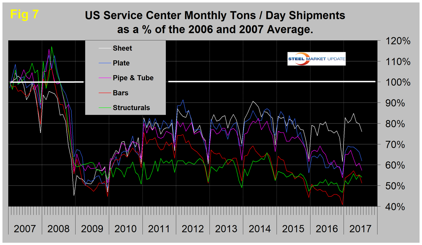 Each year, all products experience the December collapse and January pickup. In July, the total of carbon steel products was 66.2 percent of the shipping rate that existed in 2006 and 2007. Structurals and bar were 54.1 percent and 51.2 percent, respectively. Sheet was at 76.0 percent, plate at 61.9 percent and tubulars at 57.3 percent.