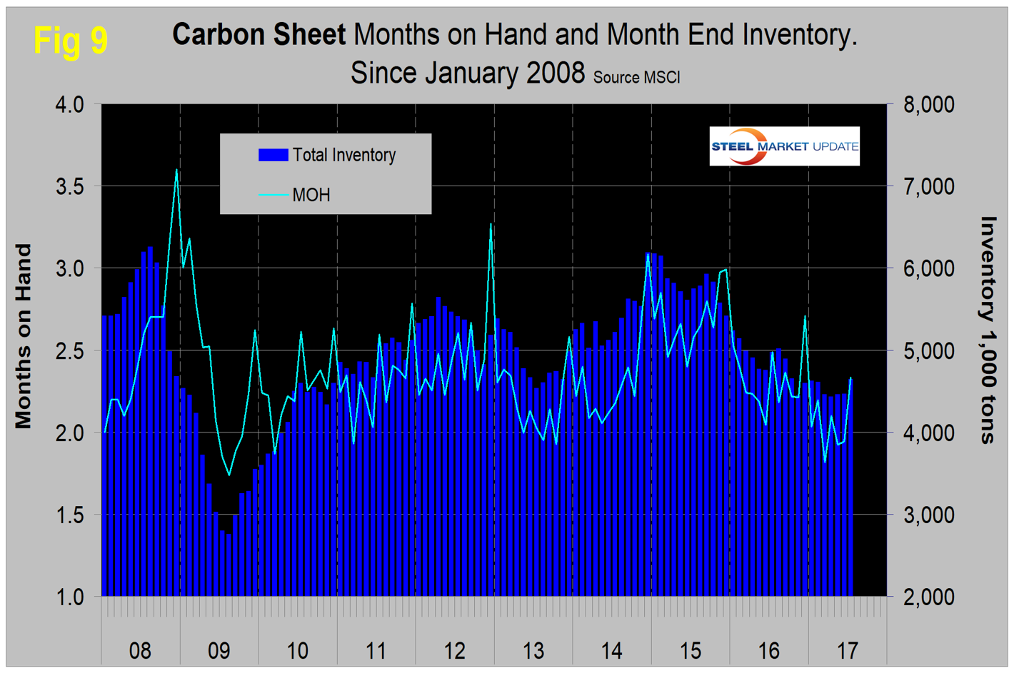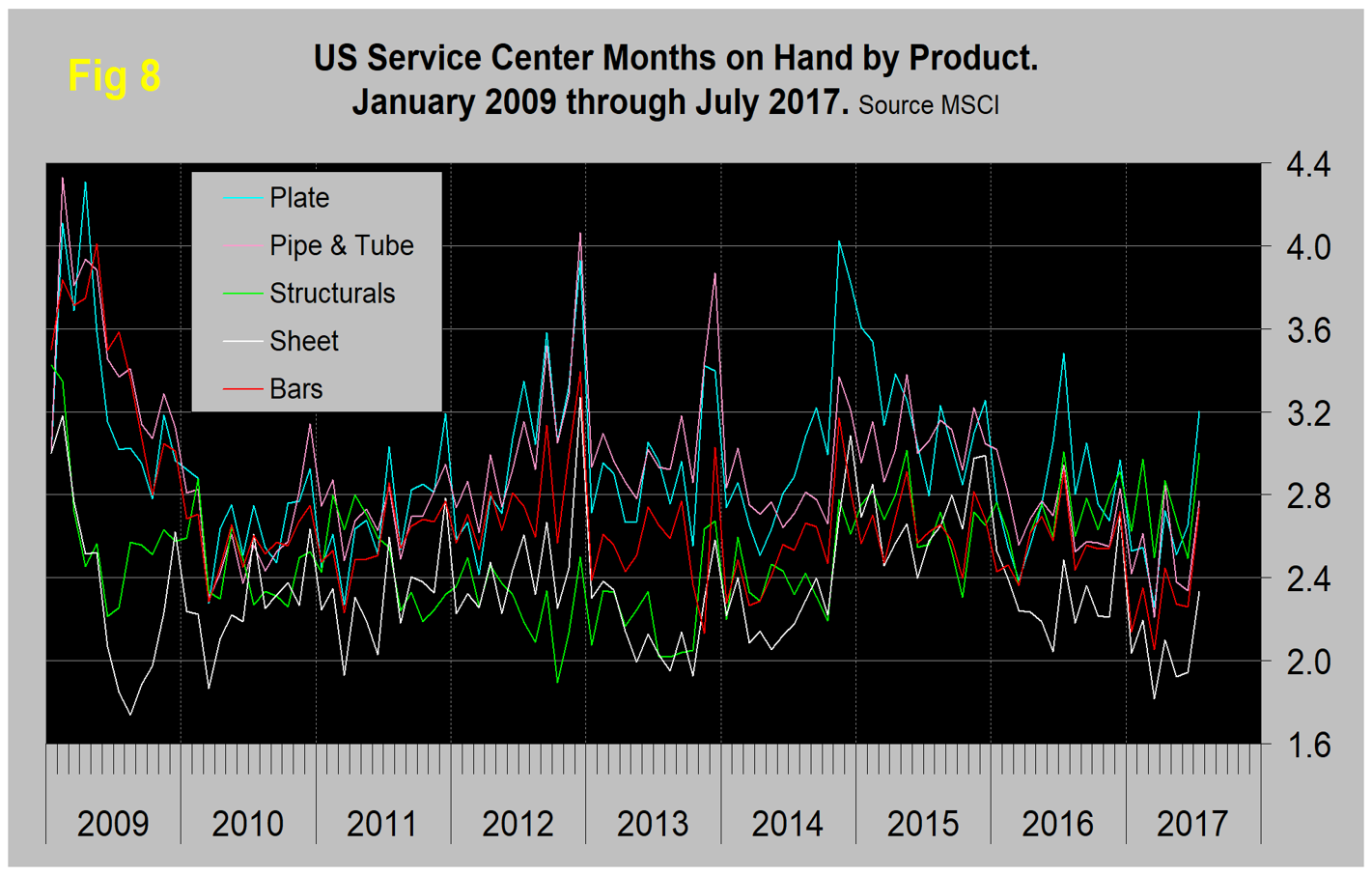 March closed with months on hand (MoH) of 1.94 for all carbon steel products, which was the lowest level in 13 years (since July 2004). April increased to 2.28, May and June declined to 2.05 and 2.09, respectively, and July increased to 2.51 months. This calculation is misleading because it is based on total shipments for the month. Therefore, it is highly influenced by the number of shipping days. The March MoH was so low because shipping days were at the maximum. Compared to July last year, months on hand in total were down by 4.4 percent, led by pipe and tube, which were down by 11.2 percent. Sheet and plate were down by 6.6 percent and 2.6 percent, respectively. Long products had an increase in MoH year over year. There were the same number of shipping days in July 2016 and July 2017 at 20 days. Figure 8 shows the MoH by product monthly since July 2009.