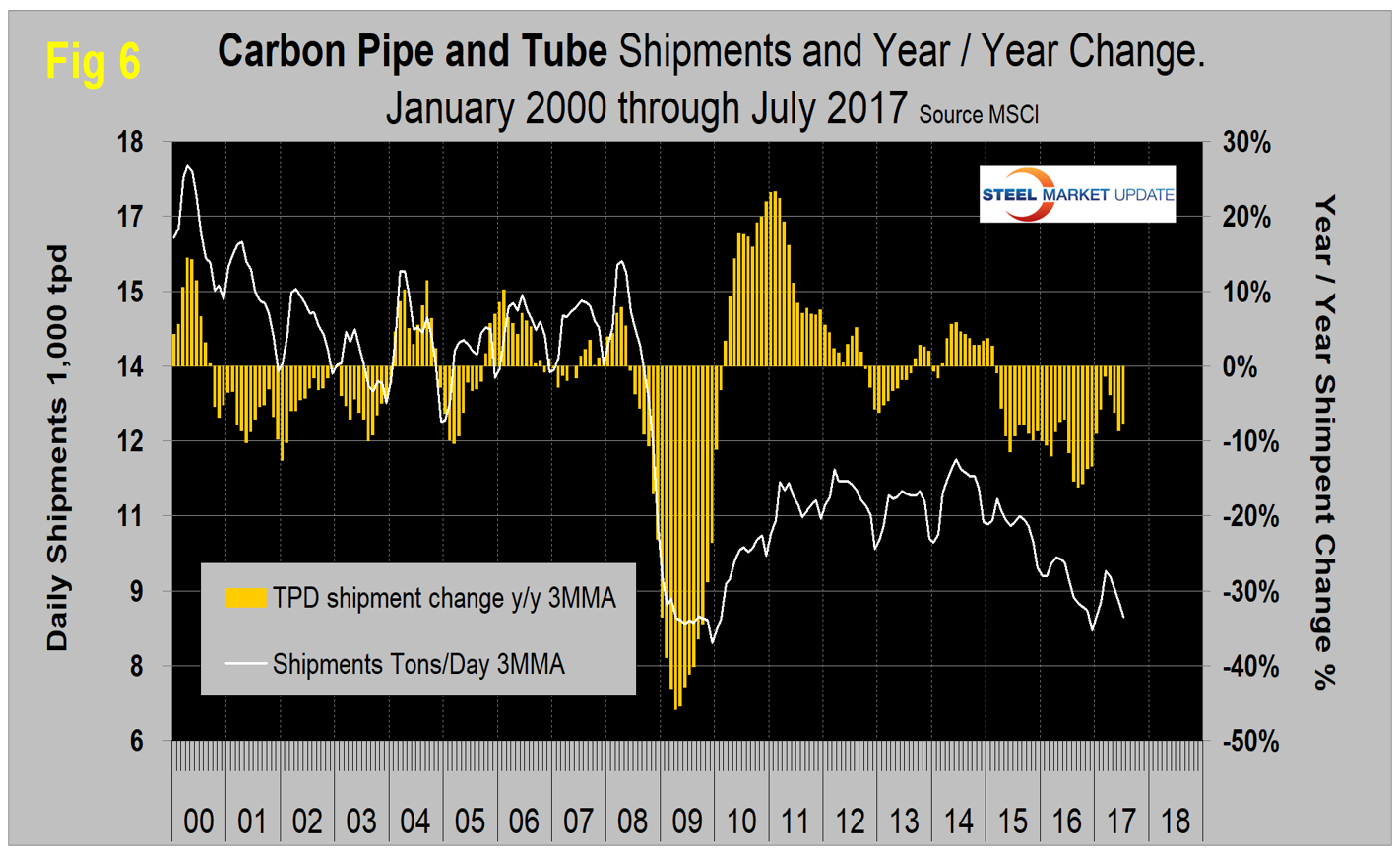 Each year, all products experience the December collapse and January pickup. In July, the total of carbon steel products was 66.2 percent of the shipping rate that existed in 2006 and 2007. Structurals and bar were 54.1 percent and 51.2 percent, respectively. Sheet was at 76.0 percent, plate at 61.9 percent and tubulars at 57.3 percent.