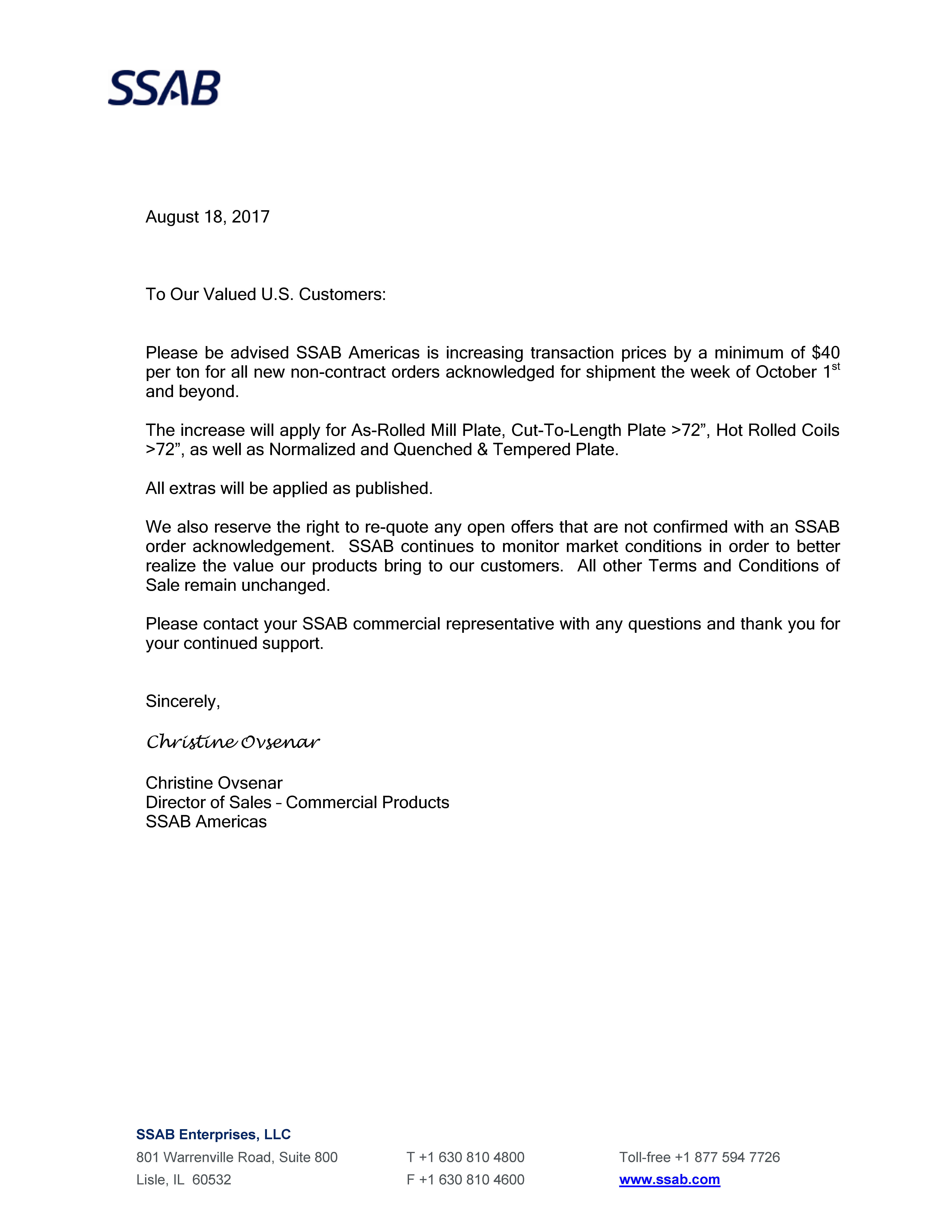 “SSAB continues to monitor market conditions in order to better realize the value our products bring to our customers,” stated the letter the company sent to customers today announcing the price change.