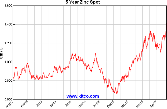 Zinc prices hit a 10-year high this past week, climbing to $3,000 per metric ton ($1.36 per pound) on the London Metal Exchange on Wednesday. Strong global demand and shrinking inventory boosted prices, as well as a shortage of Chinese zinc.
