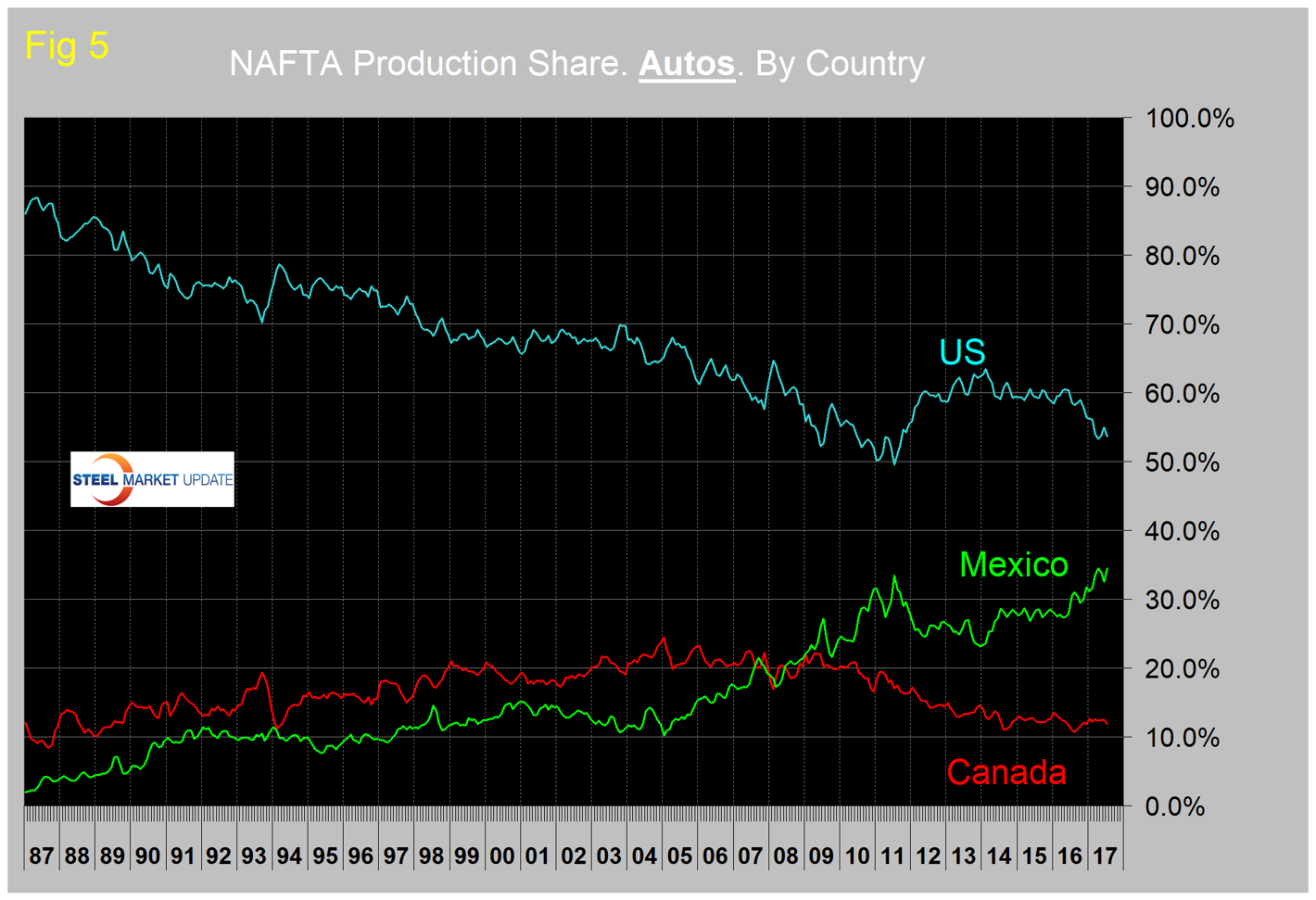 This shift is most pronounced for autos as shown in Figure 5. The U.S. now has a market share in autos of 53.7 percent, versus Mexico’s 34.5 percent and Canada’s 12.8 percent.