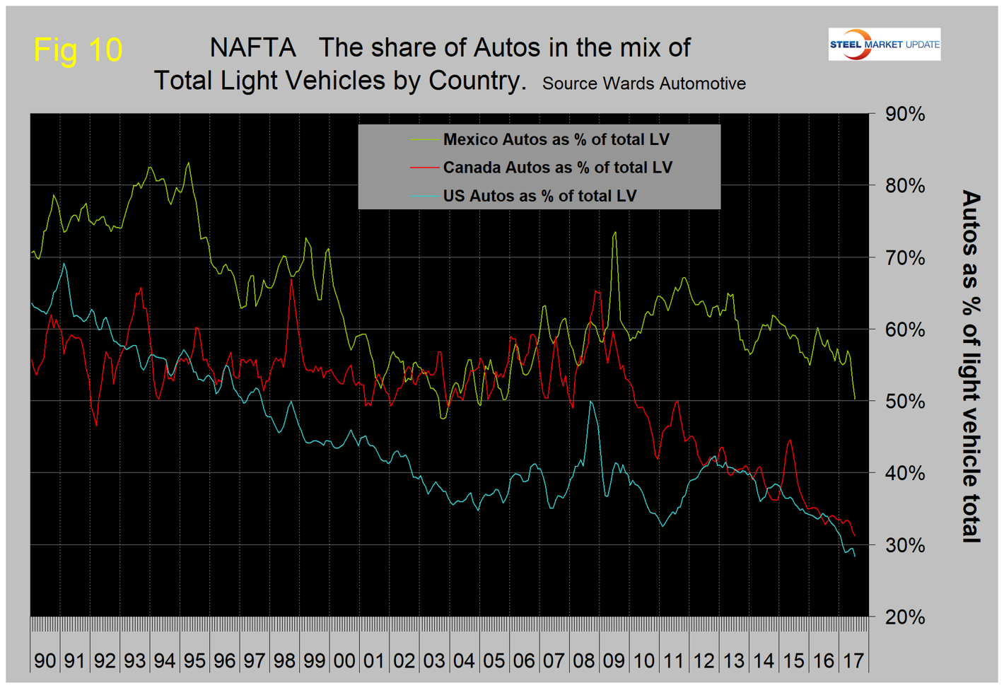 Up until this year, the U.S. market share of light trucks hadn’t changed much since mid-2009. But in 2017, there has been a sharp increase in Mexico’s share at the expense of the U.S., with Canada little changed (Figure 6). The U.S. share is now 69.2 percent, Mexico’s is 17.4 percent and Canada’s is 13.4 percent. In three months through July year over year, Mexico’s production of light trucks grew by 29.4 percent. The U.S. grew by 1.6 percent and Canada contracted by 0.2 percent.