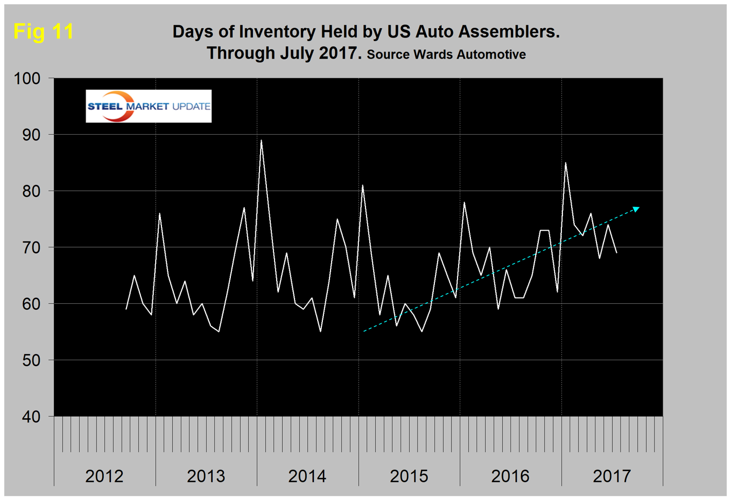 Ward’s Automotive reported this week that total light vehicle inventories in the U.S. were 69 days at the end of July, down from 74 days at the end of June. Month over month, FCA’s (Fiat Chrysler Automotive) inventory rose from 71 to 74 days, GM was down one to 104 days and Ford was down 3 to 76 days. To put those results into perspective, Toyota was down 14 to 50 days. Figure 11 shows that inventory days of sales in the U.S. has exhibited an increasing trend since Q2 2015.
