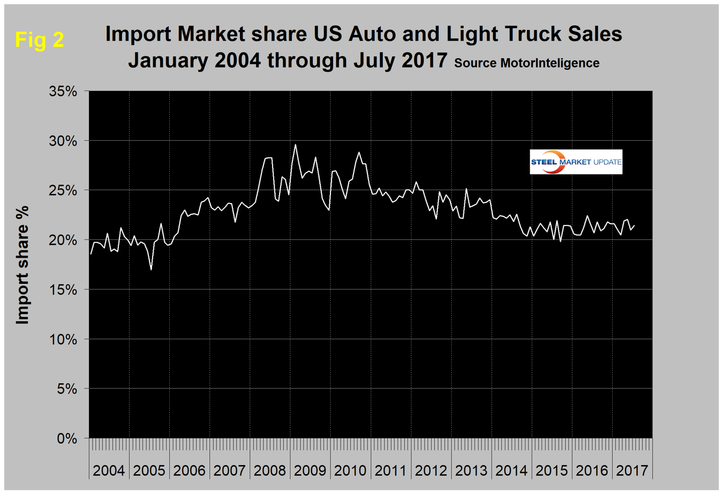 Figure 1 shows auto and light truck sales since January 2004. Import market share at 21.4 percent in July has changed little in the last 18 months as shown in Figure 2.