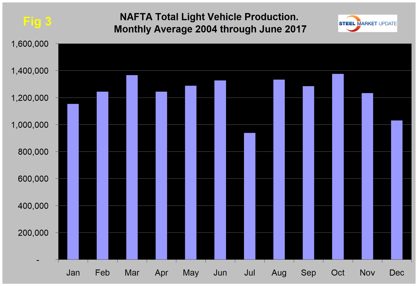 Total light vehicle production in NAFTA in July hit an annual rate of 12.694 million units, down from 18.519 million in June. On average since 2004, July’s production has declined by 29.2 percent from June as the auto companies take their summer maintenance and re-tooling shutdowns. This year production dipped by 31.5 percent, therefore weaker than normal (Figure 3). Year to date through July 2017, production was down by 1.8 percent from the same period in 2016. Note: production numbers are not seasonally adjusted; the sales data reported above are seasonally adjusted. Another consideration to note is that auto assemblies in NAFTA are a complex mix of parts and subassemblies moving both ways between nations and particularly across the southern border. We are reporting on the point of final assembly and have no data to assess how the trade in parts affects the total value mix between nations.