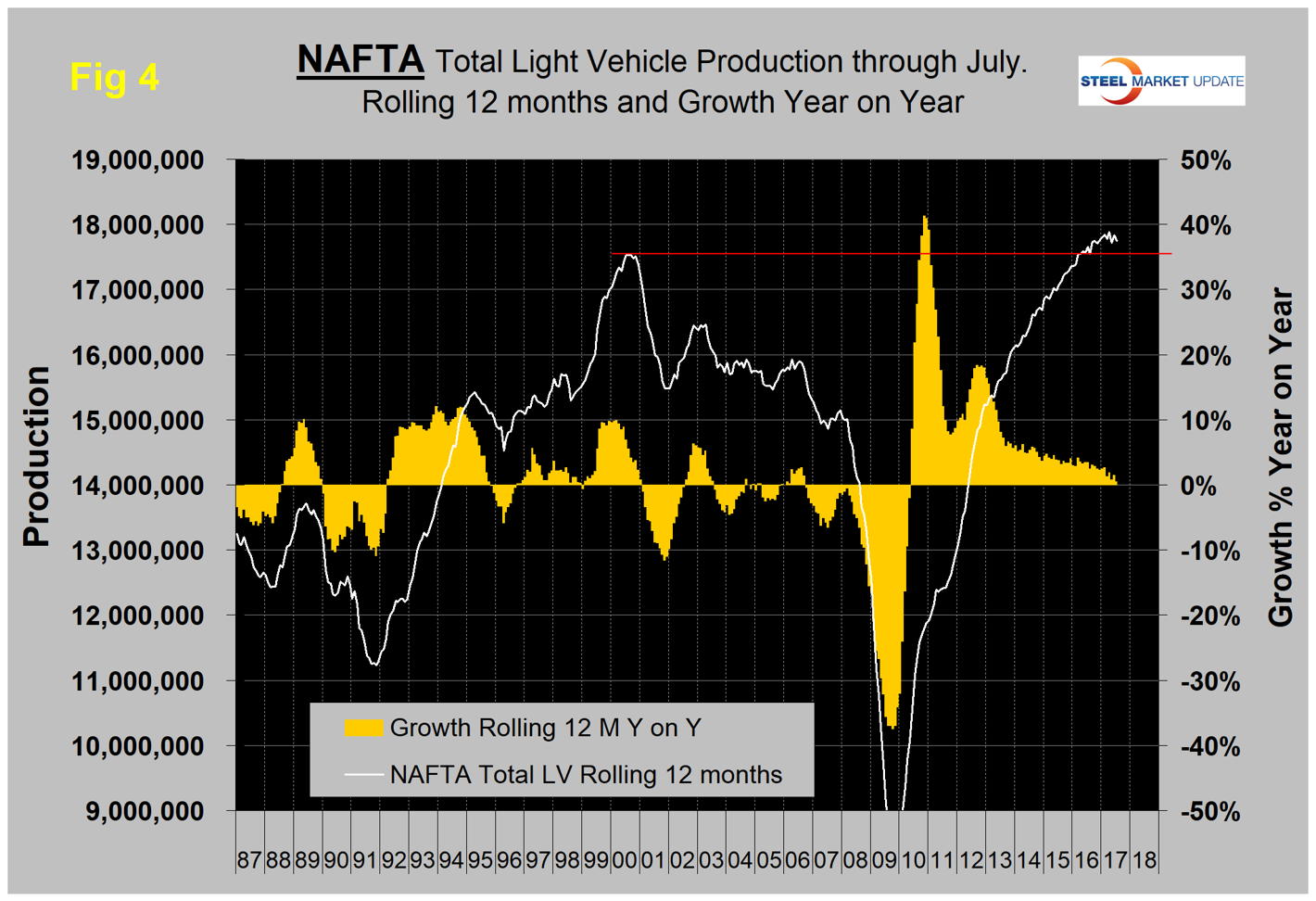 On a rolling 12 months basis year over year through July, light vehicle production in NAFTA increased by 0.5 percent, which was down from the 1.5 percent achieved in 12 months through June. There has been a very gradual slowdown in growth for the last three years as indicated by the brown bars in Figure 4; however, production has been higher than the previous all-time high every month since early 2016.