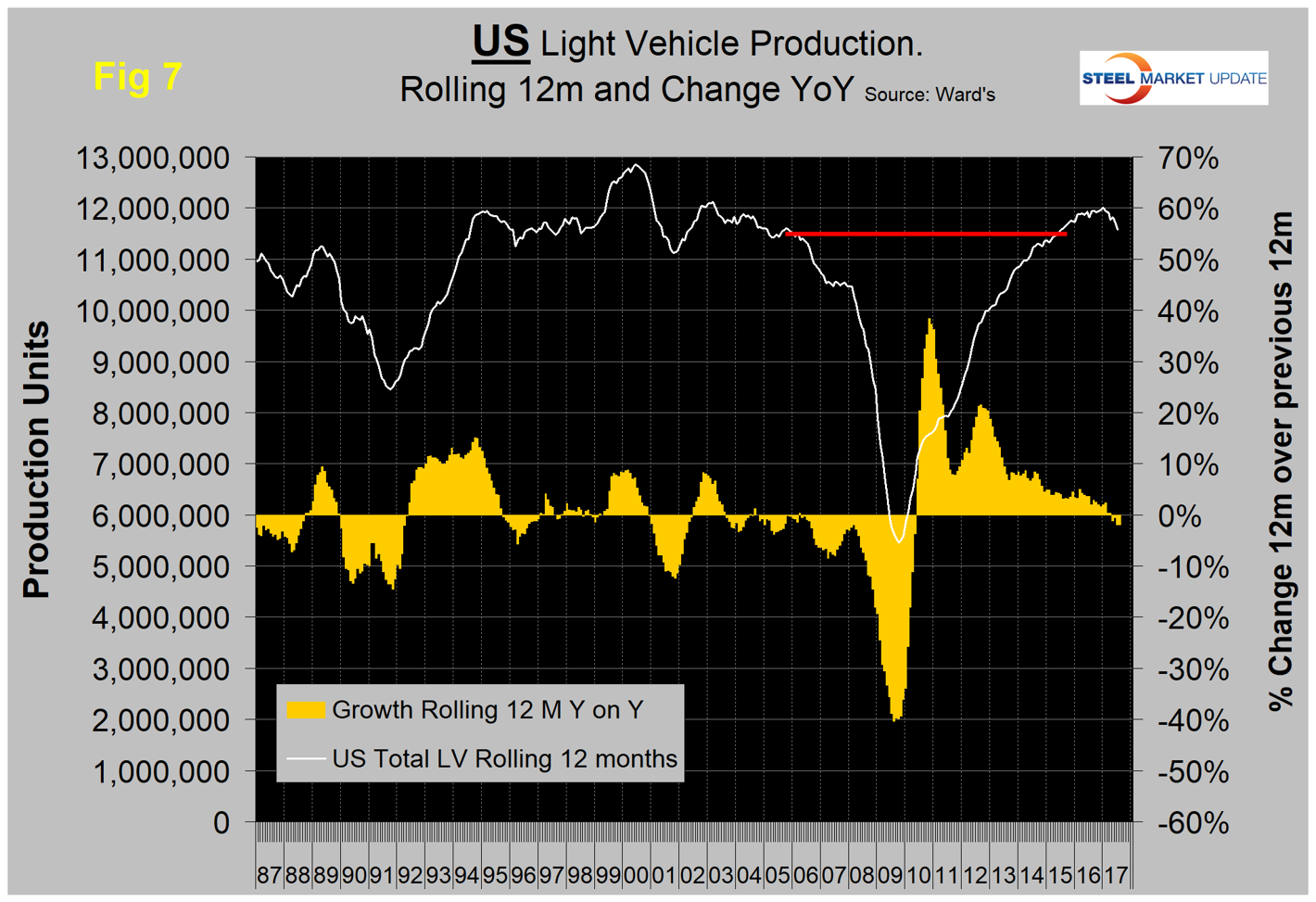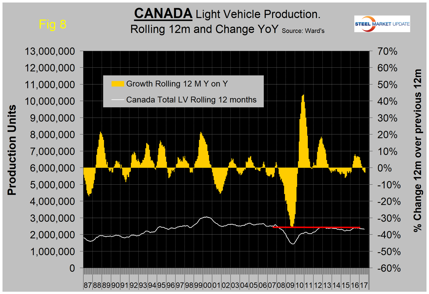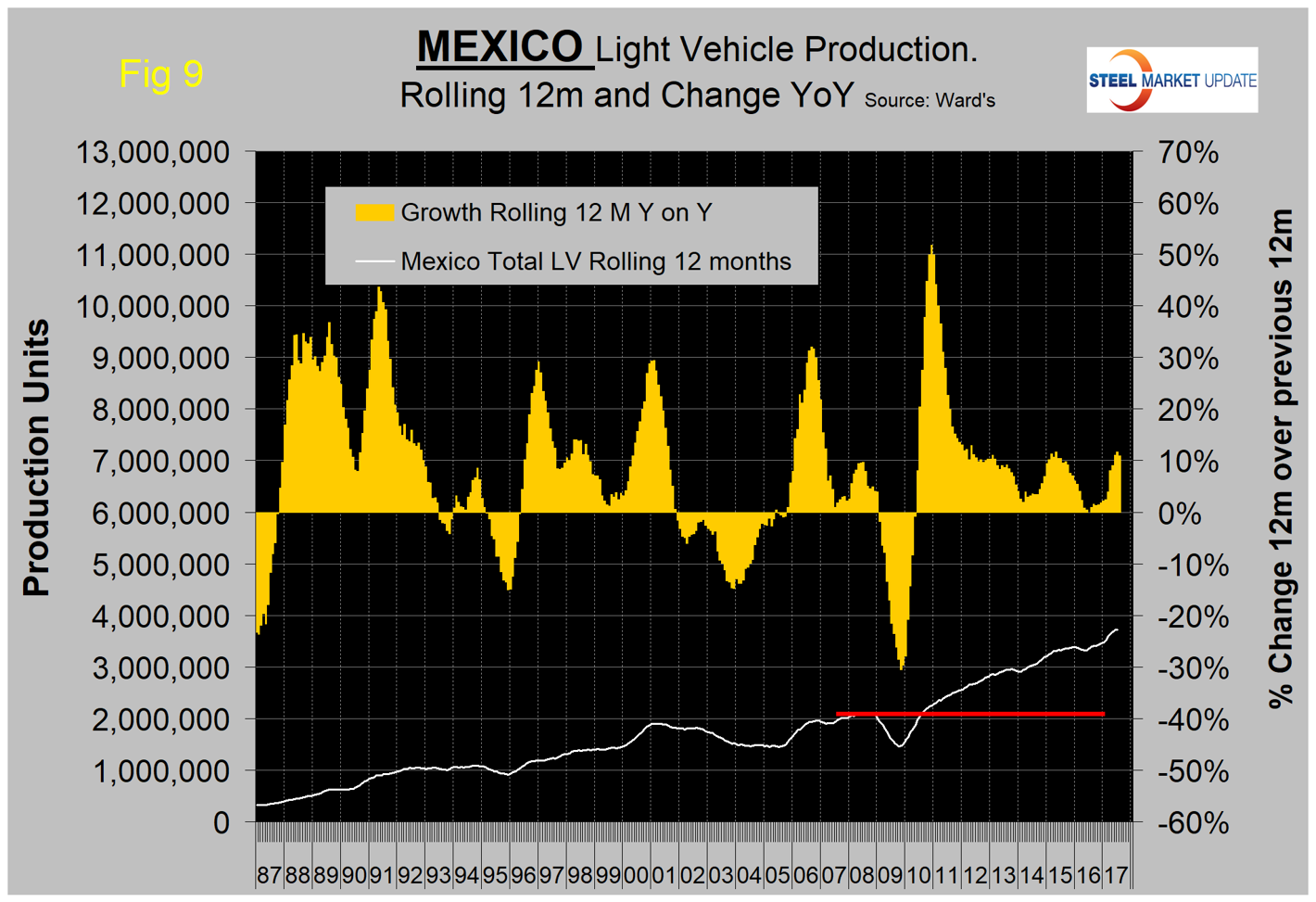 Figures 7, 8 and 9 show total light vehicle production by country with year-over-year growth rates as the brown bars. The red line on each chart shows the change in production since Q2 2006. Note the scales are the same to give true comparability and that Mexican growth has surged in 2017.