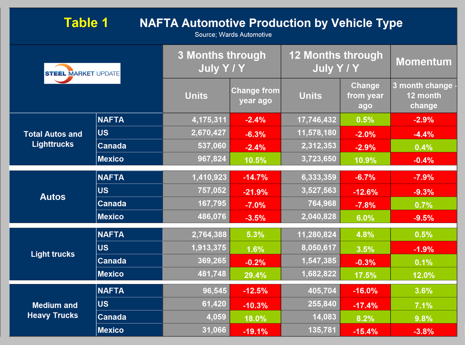 Light vehicle assemblies in NAFTA declined sharply in July, according to data from Ward’s Automotive.