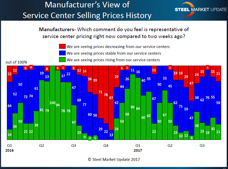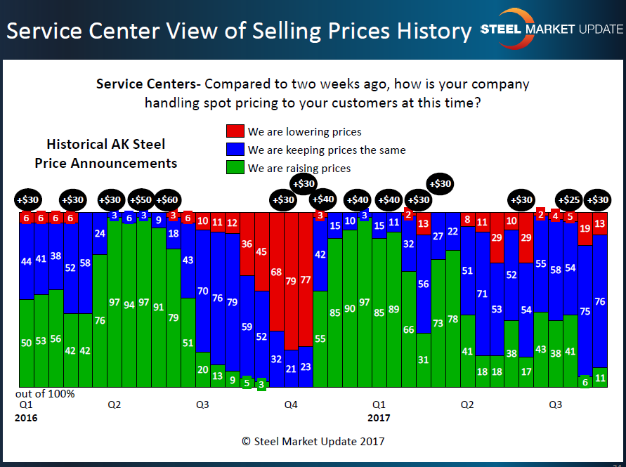 A note about the graphic shown above: The black ovals represent AK Steel price increase announcements. We use AK Steel as a reference point because they are the only steel mill that publishes their price announcements on their website. This allows both buyers and sellers of steel (and all of our readers) to check the AK Steel site for exact announcement dates and to confirm that our graphic is correct. Green bars represent service centers raising spot prices (percentage of the service center respondents who report their company as raising spot prices). Red bars are those reporting spot prices as decreasing. Blue, prices remain the same as reported two weeks prior.