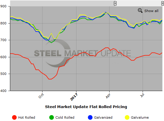 SMU Note: Below is a graphic showing our hot rolled, cold rolled, galvanized, and Galvalume price history. We will add plate prices to this graph once we have gathered a few months of data. To use the graph’s interactive capabilities, you must view it on our website here. If you need help navigating the website or need to know your login information, contact us at info@SteelMarketUpdate.com or by calling 800-432-3475.