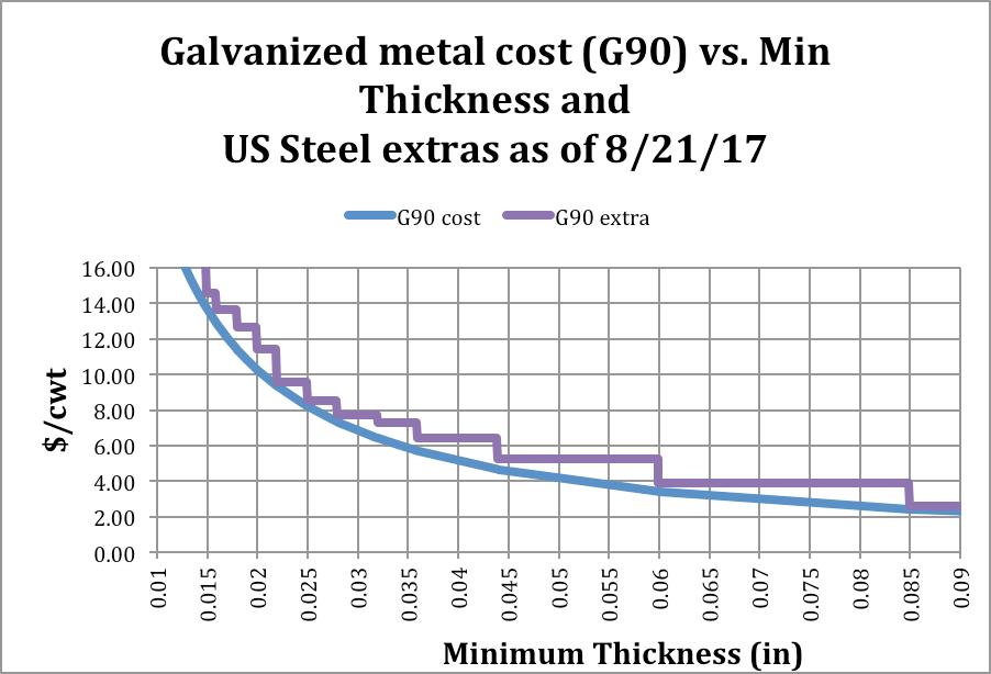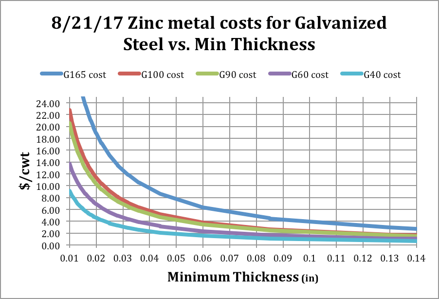 As you can see, the difference between the cost of coating steel with zinc and the extra is quite small. For instance, at 0.025” minimum thickness, the difference between the mill’s cost for zinc and the price they charge is only $0.27/cwt. That $0.27/cwt must cover all the mill’s galvanized processing costs (energy, labor, depreciation, etc.) just to break even on this size.
