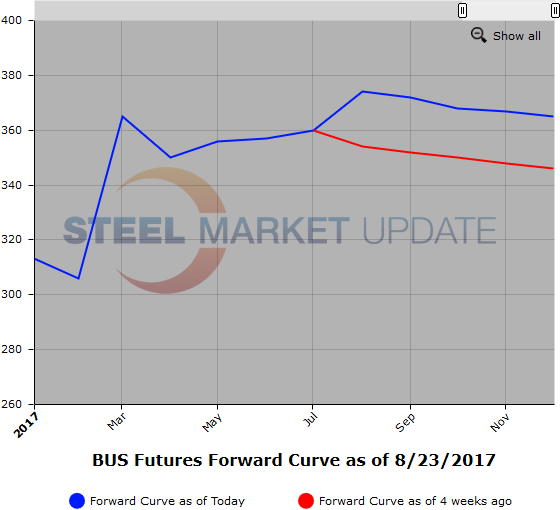 Market chatter has Sep’17 BUS prices rising from $20-$30/GT. Lighter summer auto production schedules, as well as expected shortages of scrap alternatives due to maintenance and higher prices, have kept BUS futures prices well bid.