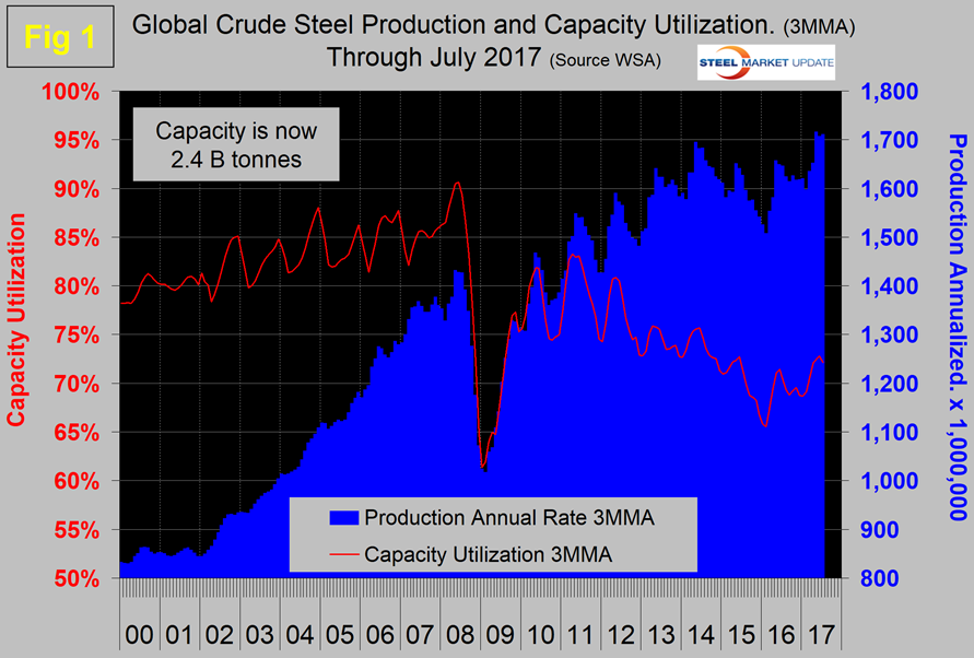 Global crude steel production in the month of July totaled 143,245,000 metric tons, up from 141,331,000 metric tons in June. Capacity utilization was 71.7 percent, down from 73.0 percent in June. Capacity utilization went down as production went up because there was one more day in July and tons per day production declined slightly in July. The three-month moving averages (3MMA) that we prefer to use were 142,584,000 metric tons and 72.1 percent, respectively. Capacity is 2.4 billion metric tons per year. Figure 1 shows monthly production and capacity utilization since January 2000.