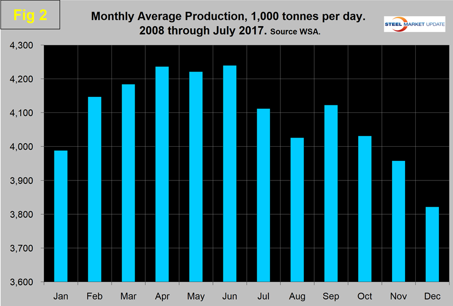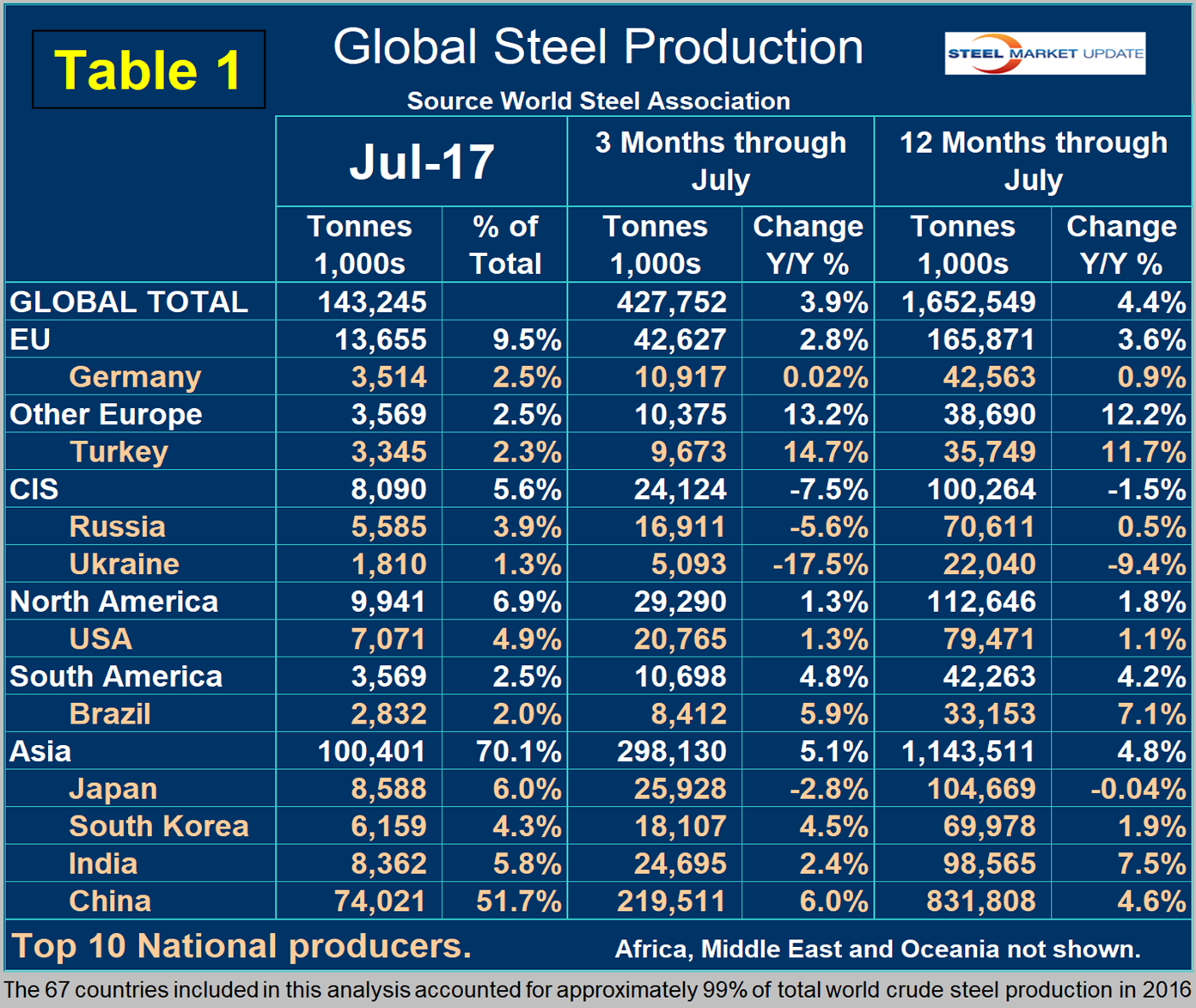 Table 1 shows that in three months through July year over year, every region except the CIS had positive growth. North America was up by 1.3 percent. Within North America the U.S. was also up by 1.3 percent, Canada was down by 1.0 percent and Mexico up by 3.1 percent. In the 1st half of 2017, Mexico produced 54.8 percent more steel than Canada. Other Europe led by Turkey had the highest growth rate in three months through July year over year. Asia as a whole was up by 5.1 percent.