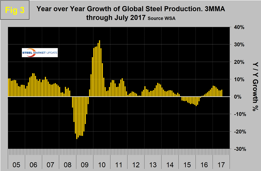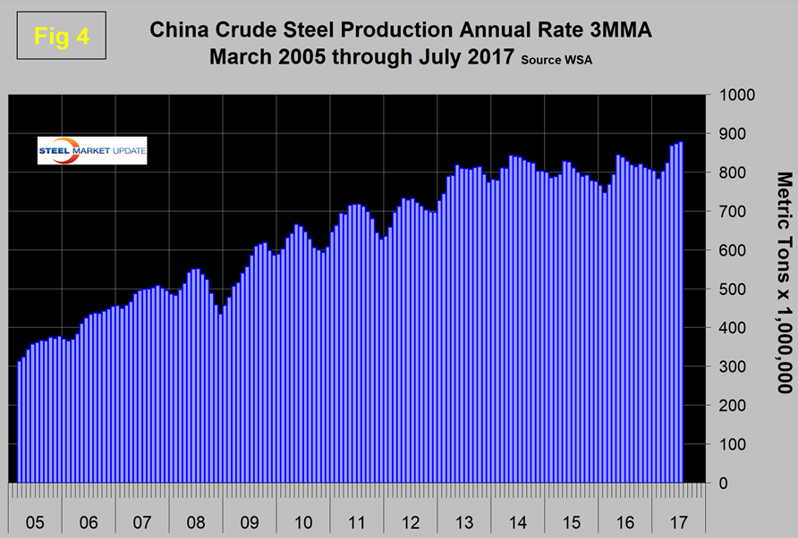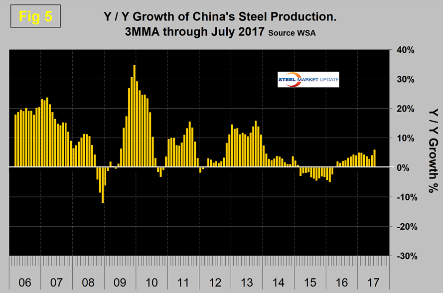 China’s production after slowing for 13 straight months year over year returned to positive growth each month in May 2016 through July this year on a 3MMA basis. The slowdown in Chinese steel production that they have been promising is not happening. However, Platts reported on Aug. 9 that the mandatory closure of induction furnaces in China, together with stronger domestic demand for rebar, had resulted in a 74 percent reduction in exports of long products. Total steel exports in 2017 are tracking at 75 million metric tons per year, down from 110 million last year. That’s 35 million metric tons of steel that the world won’t have to compete with in 2017.