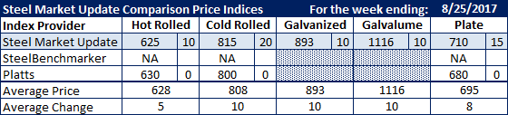 Last week, Steel Market Update (SMU) saw prices as being modestly higher than the week before, while Platts held their prices steady. For the week, SMU had hot rolled up $10, but our $625 per ton average is still below the $630 being reported by Platts.
