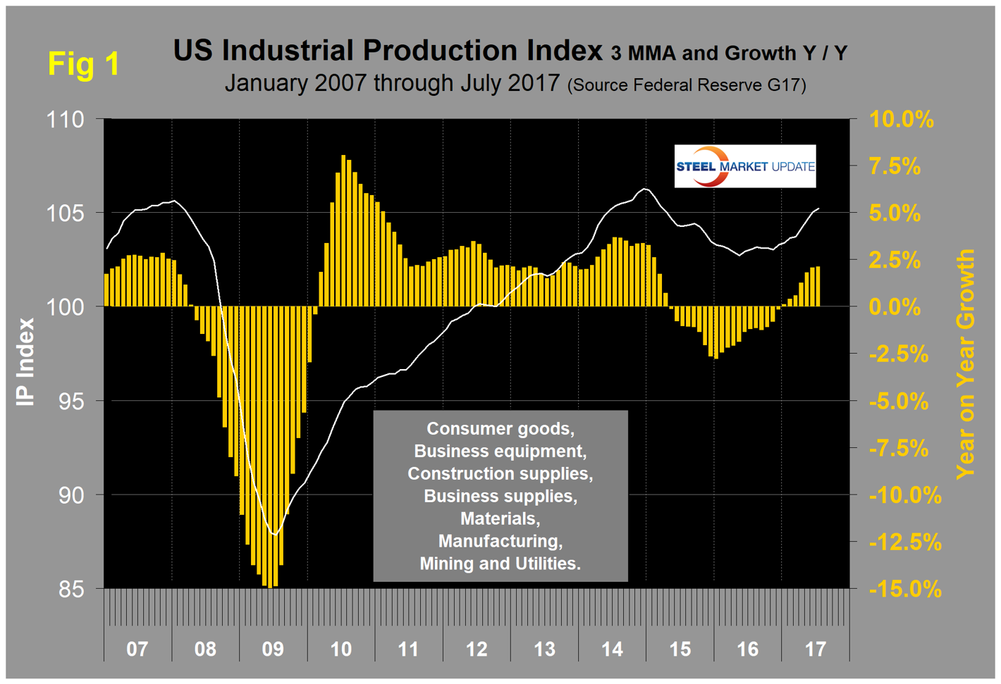 The Industrial Production Index: Figure 1 shows the IP index since January 2007 with the year-over-year growth. The three-month moving average (3MMA) had negative growth every month from October 2015 through December 2016 as shown by the brown bars in Figure 1.