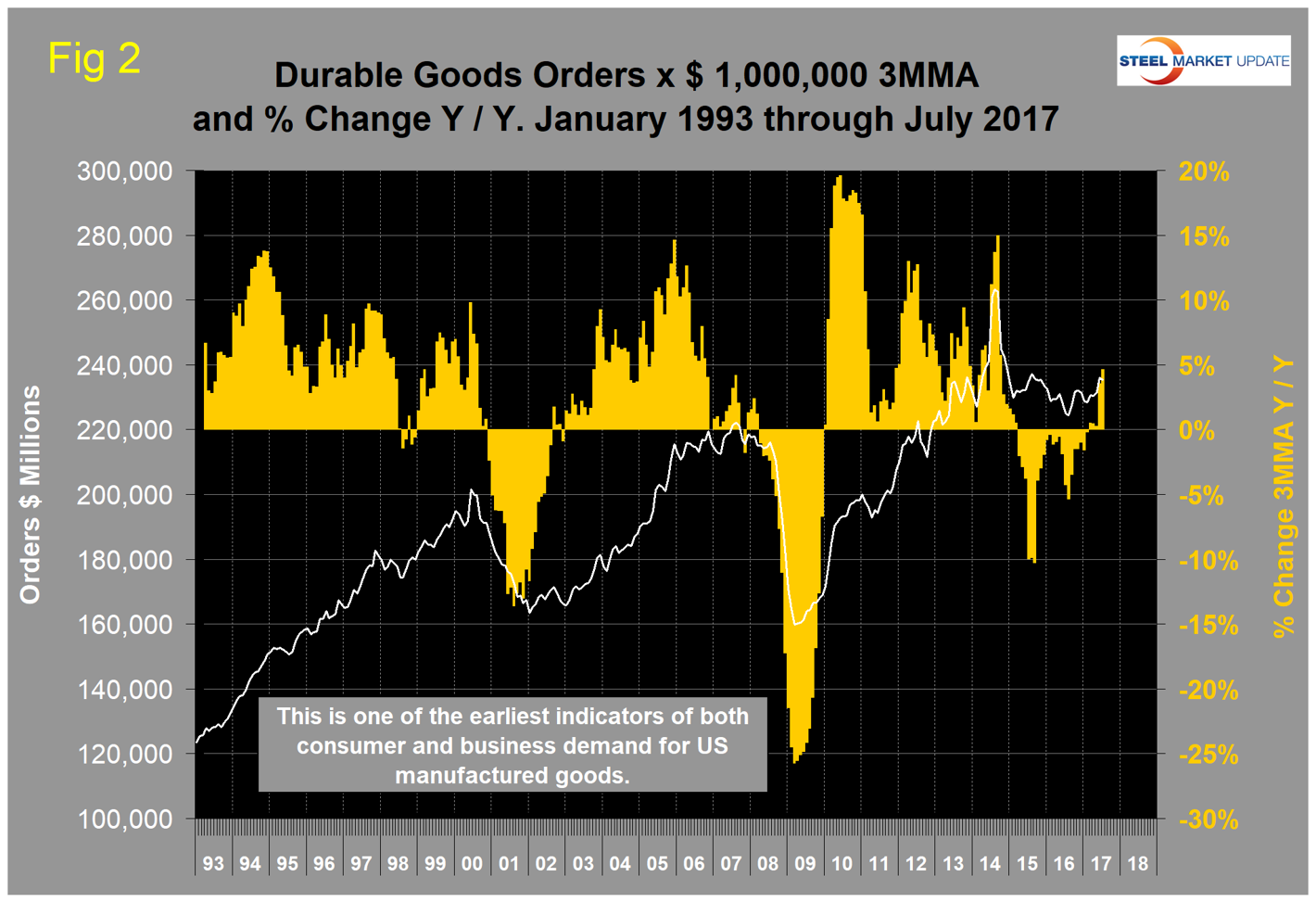 At SMU, our take on this is somewhat more positive because we think it’s necessary to look at a 3MMA to get a more realistic picture. Figure 2 shows the 3MMA of monthly orders for durable goods since January 2010 with the percent change year-over-year.