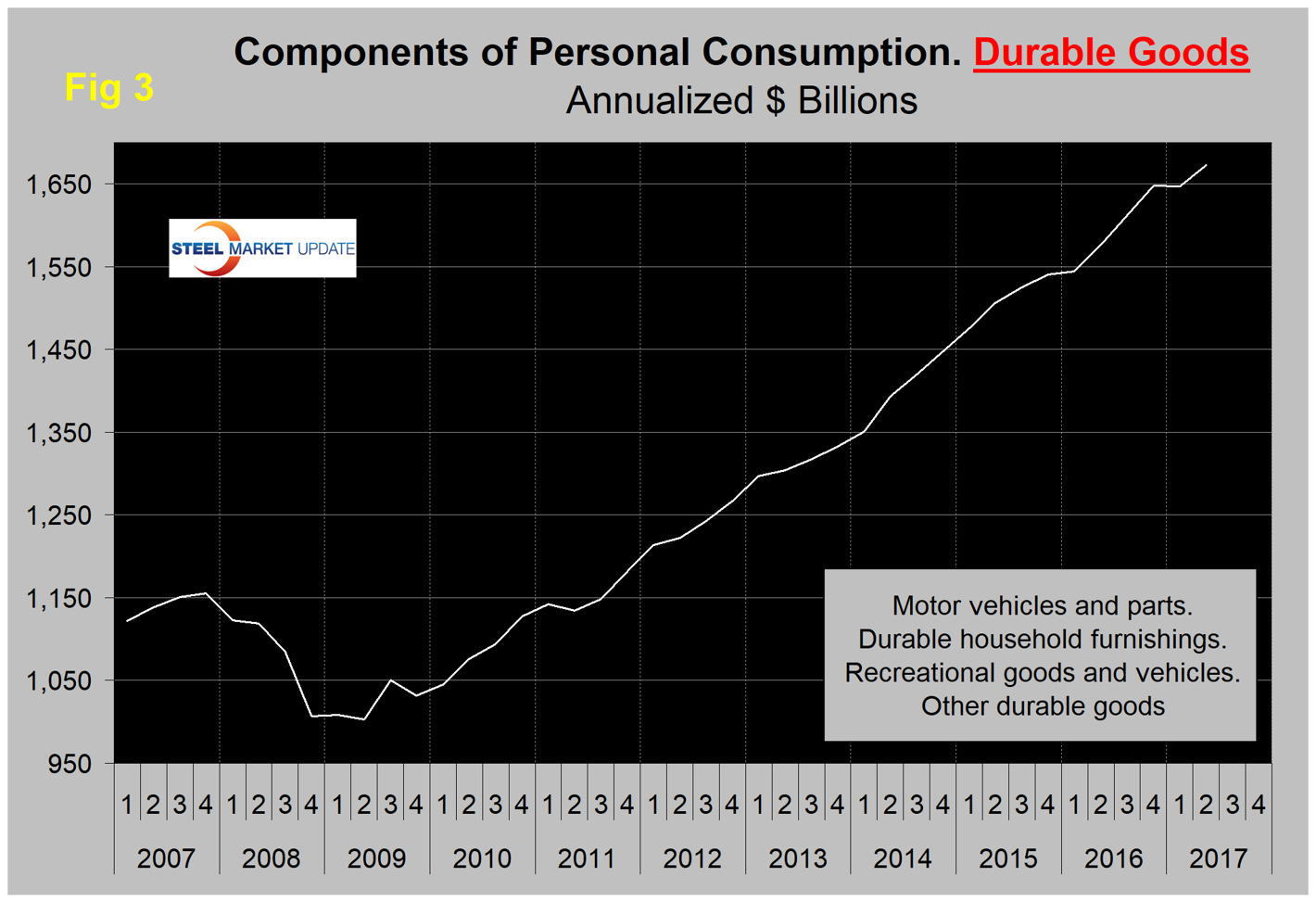 The Durable Goods Portion of GDP: The first estimate of Q2 GDP was released late last month. A sub-component of the quarterly data is durable goods, which is part of the personal consumption calculation. It therefore contains no military hardware or civil aircraft data. This is shown in Figure 3 and presumably because of the exclusions just mentioned looks nothing like Figure 2.