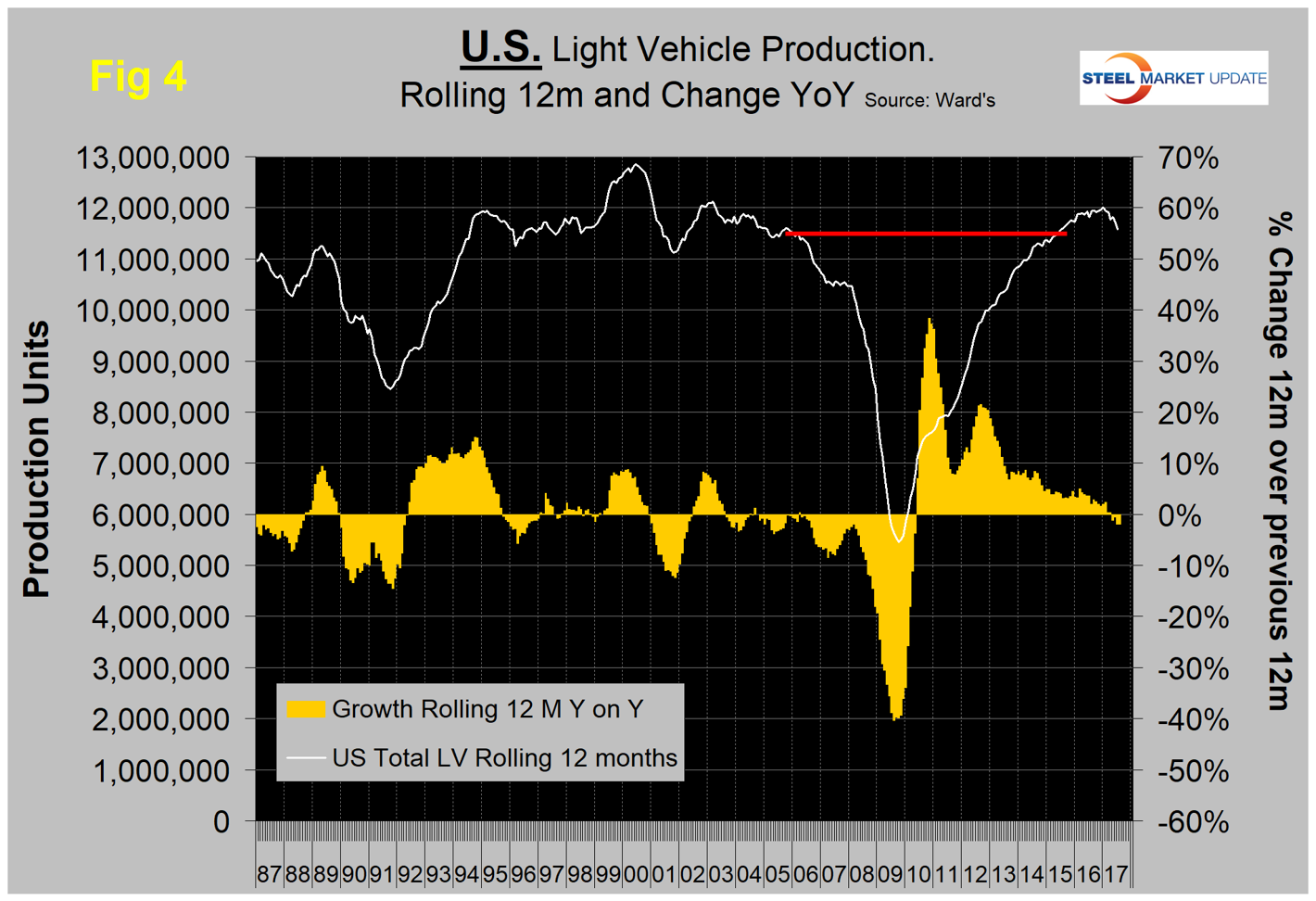 Light Vehicle Production: Light vehicle production in NAFTA declined by 2.4 percent in three months through July year-over-year. Assemblies in the U.S. declined by 6.5 percent, but in Mexico increased by 10.5 percent. Mexico has been taking share from the U.S. for over a year; also from Canada to a lesser extent. Figure 4 shows light vehicle production in the U.S. on a rolling 12-month basis with the year-over-year growth rate.