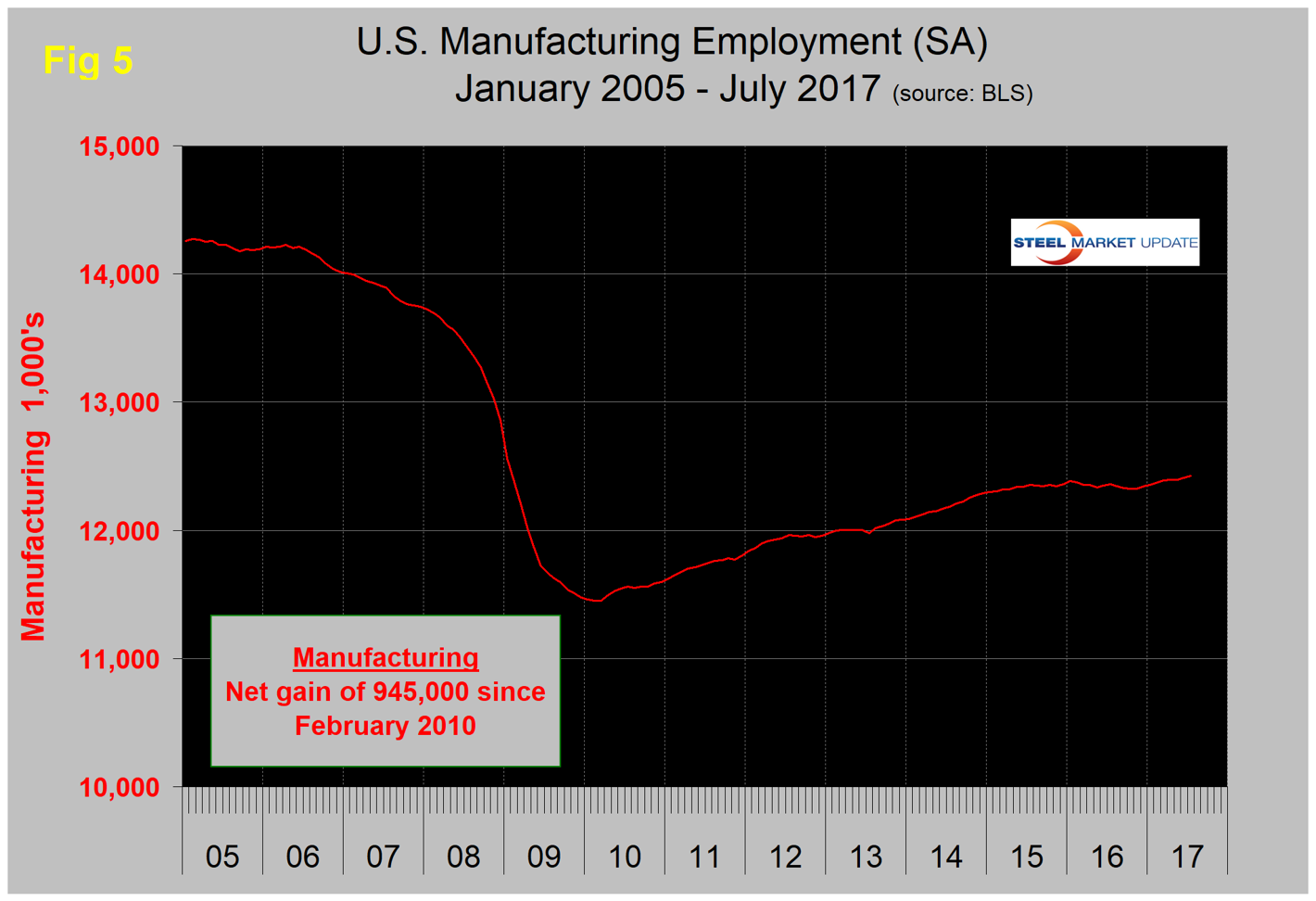 Manufacturing Employment: Manufacturing employment nosedived during the recession and gradually improved from the spring of 2010 through 2014. Growth was flat in 2015 and declined slightly in 2016 when 23,000 jobs were lost during the year. There was a turnaround in the first seven months through July this year when 82,000 manufacturing jobs were created (Figure 5).