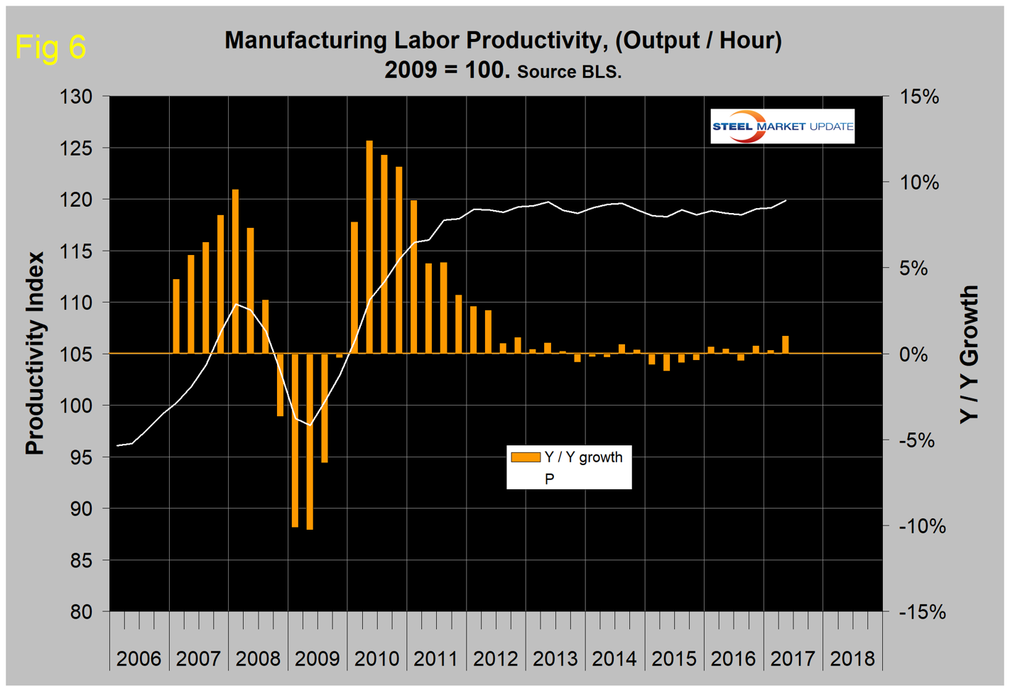 SMU Comment: The manufacturing indicators are still healthy overall and portend well for the balance of this year. The ISM index, which we give the most credence, is still signaling expansion. This is the only leading indicator examined in this update. Auto assemblies and supplier industries are slowing in NAFTA, and the U.S. and Canada are losing share to Mexico. Manufacturing employment has had positive growth in 2017, and the employment component of the ISM index has had positive growth in each of the last 10 months. The most disappointing indicator is manufacturing productivity, which despite an improvement in the second quarter has gone nowhere in the last four years.
