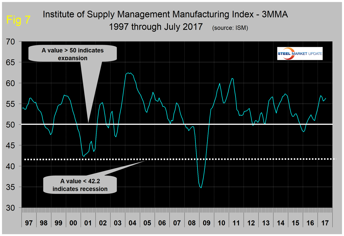 The Institute for Supply Management Manufacturing Index: ISM’s manufacturing index is a diffusion index. The institute states: “Diffusion indexes have the properties of leading indicators and are convenient summary measures showing the prevailing direction of change and the scope of change. An index value above 50 percent indicates that the manufacturing economy is generally expanding; below 50 percent indicates that it is generally declining.” Figure 7 shows the 3MMA of the ISM index from January 1997 through July 2017 with an improving trend since January 2016. The index has made no progress this year, but is still signaling future expansion with a 3MMA value of 56.3 in July. June at 57.8 was the best result since October 2014.