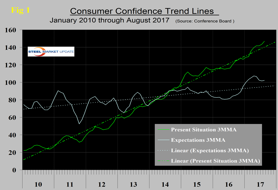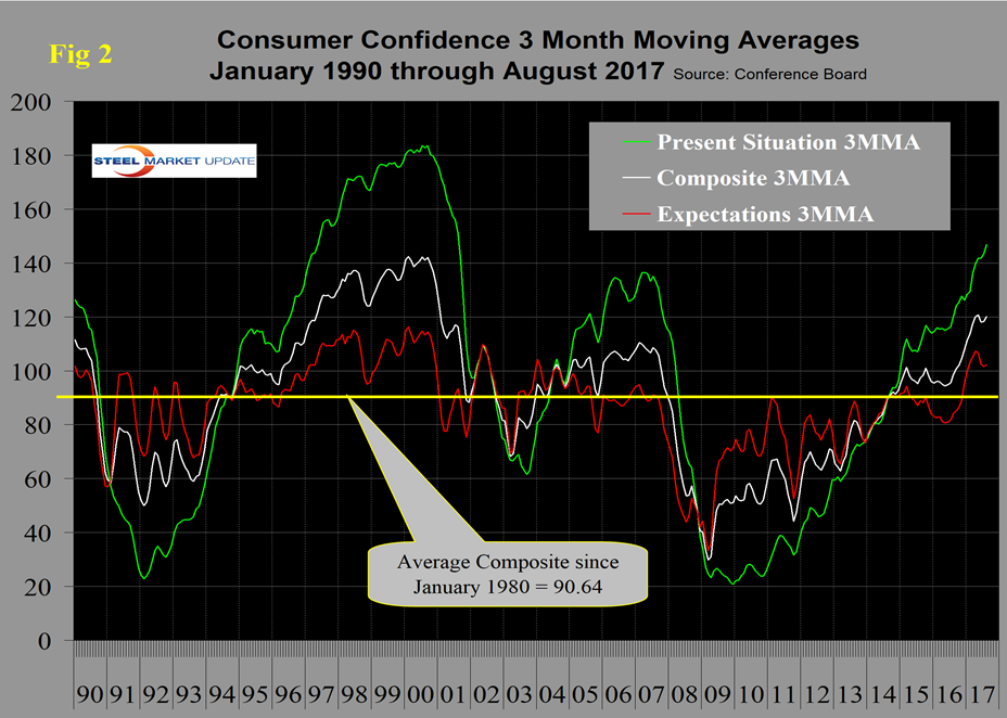 The composite value of consumer confidence in August was 122.9, up from 120.0 in July. The first estimate for July was revised down slightly. The last seven months have each been better than at any time since 2001. The three month moving average (3MMA) increased from 118.3 in July to 120.1 in August, which was 21.4 points higher than in August last year. Consumers are feeling better about the present economic environment, though their expectations have been muted for the last three months. Consumer confidence is the driver of consumer spending, which is the largest component of GDP and which ultimately drives a large portion of steel consumption.