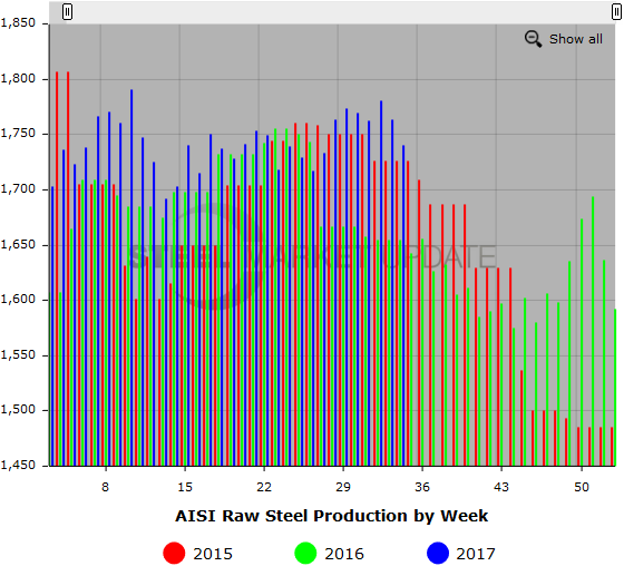 Below is a graph showing the history of weekly raw steel production. You will need to view the graph on our website to use its interactive features, you can do so by clicking here. If you need assistance logging into or navigating the website, please contact our office at 800-432-3475 or info@SteelMarketUpdate.com
