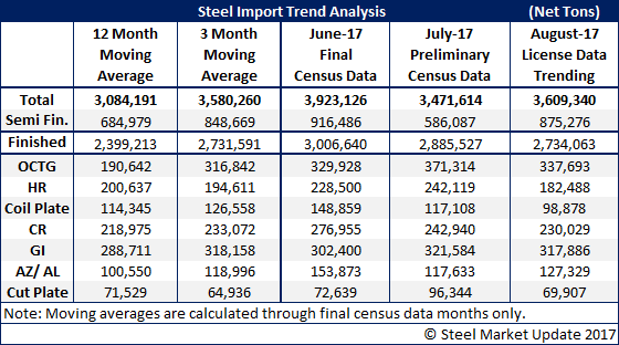 The U.S. Department of Commerce released Preliminary July import data as well as August license requests through the 29th of the month. The July Preliminary Census number has foreign steel imports as being 3,471,614 net tons. This is down from the June 3.9 million ton level. However, what continues to be concerning is the August projected number of 3.6 million tons.