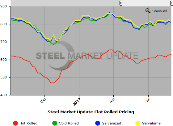 SMU Note: Below is a graphic showing our hot rolled, cold rolled, galvanized, and Galvalume price history. We will add plate prices to this graph once we have gathered a few months of data. To use the graph’s interactive capabilities, you must view it on our website here. If you need help navigating the website or need to know your login information, contact us at info@SteelMarketUpdate.com or by calling 800-432-3475.