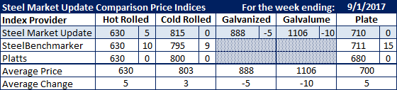 SMU, Platts and SteelBenchmarker all had hot rolled prices as averaging $630 per ton. SMU had HRC up $5, SteelBenchmarker was up $10 and Platts remained the same as the prior week.