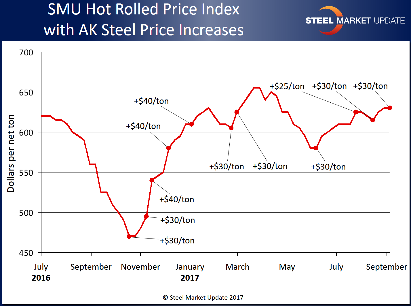 Late yesterday (Sept. 6), AK Steel announced a new $30 per ton flat rolled price increase. AK Steel last announced a flat rolled price increase three weeks ago when on Aug. 16 the steel mill raised prices by $30 per ton.