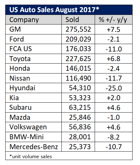 U.S. automakers sold 1.48 million vehicles in August, a 1.9 percent drop from a year ago. A portion of that decline was the loss of an estimated 20,000 sales from the Houston area during the last week of August.