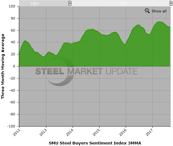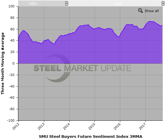 Both current and future sentiment showed a slight improvement in the latest SMU Steel Buyers Sentiment Index, based on data gathered in early September. The index measures how buyers and sellers of flat rolled steel feel about their company’s ability to be successful both in the current market environment, as well as three to six months into the future. Overall, the indexes have remained at optimistic levels throughout 2017.