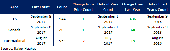 The weekly U.S. rig count remained steady this week, according to Sept. 8 data from Baker Hughes, a GE Company. The number of active oil rigs declined by 3 to 756 rigs, while the active gas rig count rose 4 to 187 rigs. The miscellaneous rig count was unchanged at 1 rig. Compared to this time last year, the 944 count is up 436 rigs, with oil rigs up 342, gas rigs up 95, and miscellaneous rigs down 1.