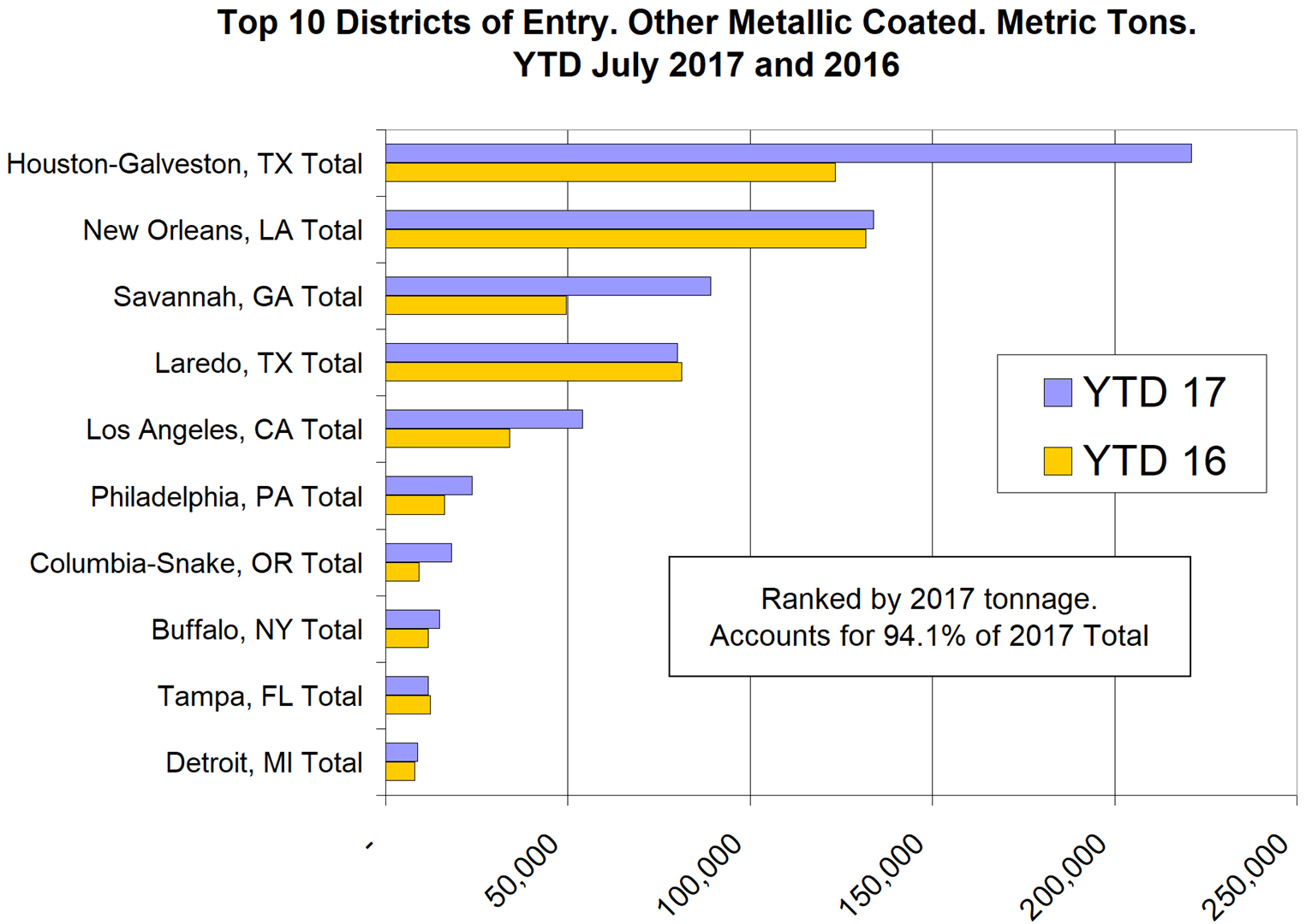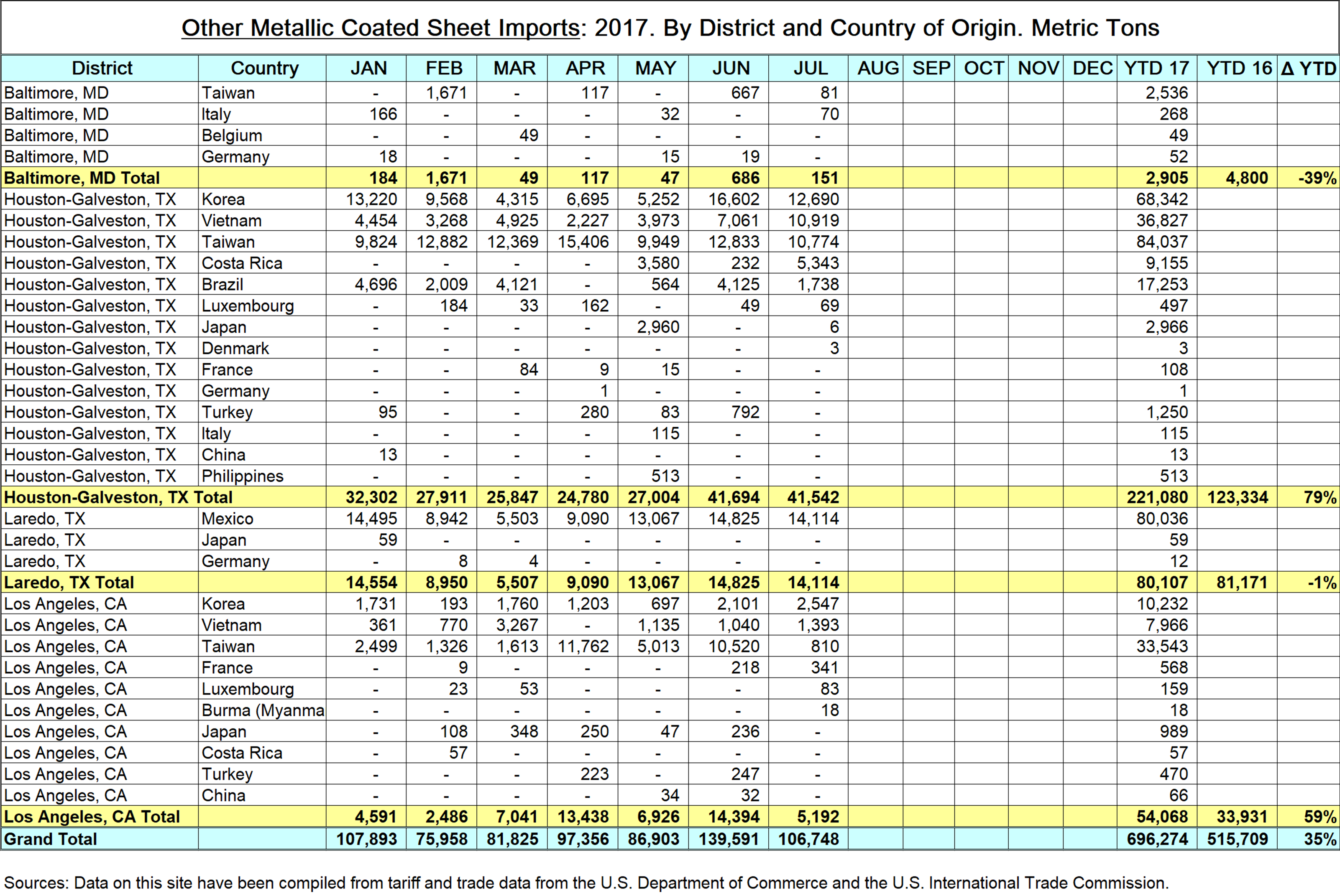 This month, we will use other metallic coated (mainly Galvalume) to make our point. In 2017, from January through July, 696,274 metric tons of OMC entered the country, which was an increase of 35.0 percent from the first seven months of 2016. As an illustration of regional differences, Houston was up by 79 percent, Baltimore was down by 39 percent, Laredo broke even, and Los Angeles was up by 59 percent. The table included here (click to enlarge) is a small extract from one of the four spreadsheets in the premium section of our website. These spell out the monthly tonnage by source for 33 districts around the country for HRC, CRC, HDG and OMC.