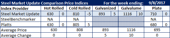 There was little movement in the steel indexes followed by Steel Market Update (SMU) last week. Both Platts and SMU have hot rolled average as being $630 per ton ($31.50/cwt). Cold rolled average was $805 (+$5) out of Platts and $810 (-$5) on our own CRC index.