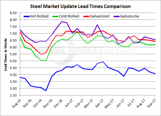 Galvalume lead times in early September averaged 6.55 weeks, down from 6.75 weeks in early August.