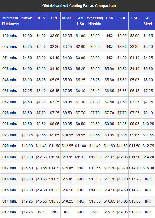 Updated Galvanized G90 Mill Coating Extras Comparison