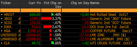 Scrap and iron ore futures were down 3.4 percent and 2.7 percent on the day, while base metals were all down, but not by more than 0.7 percent. Oil had a nice day gaining almost 1 percent and trading above $50/bbl for some of the day.