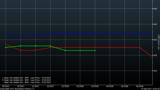 In spite of the most recent price increase announcement and strong ISM PMI data, CME Midwest HRC futures have moved down from $635 on Aug. 31 to the $620-$625 range as of today. The curve remains flat.