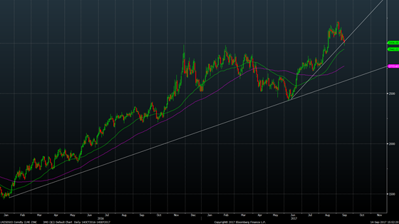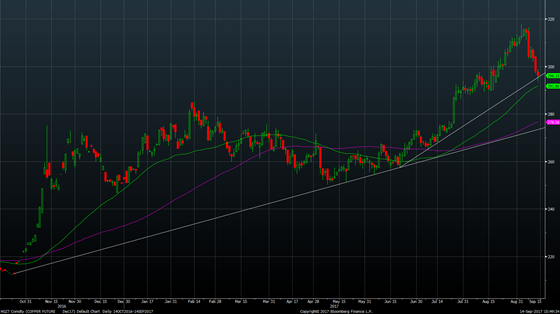 LME zinc is showing a similar pattern to copper, although it closed just below its short-term uptrend line.