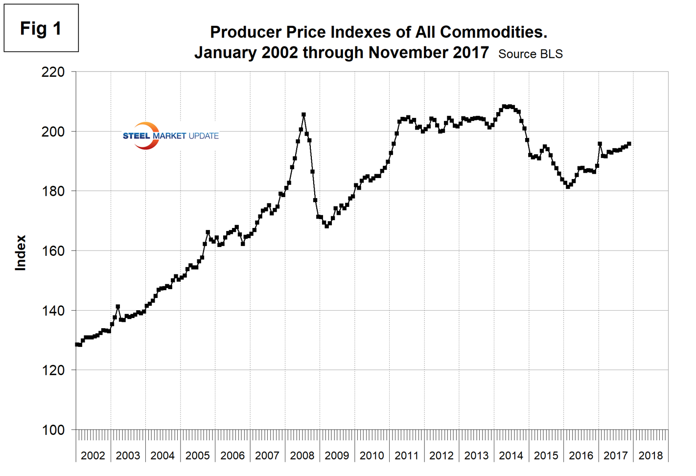 On Thursday, the BLS released its series of producer price indexes (PPIs) for more than 10,000 goods and materials. (For an explanation of this program, see the end of this piece.) The latest release reported results through November. We run this analysis every three or four months to provide information for subscribers on any changes in the competitive position of steel against other materials and rail vs. truck transportation. The PPI data are helpful in monitoring the price direction of steel and steel products against competing materials and products. As far as we can tell from comparison with known transaction prices, these PPI are a reasonable representation of the real world, though there may be a lag between the BLS reports and spot prices for steel products. We have also concluded that the actual index values of the PPIs of different products cannot be compared with one another because they are developed by different committees within the BLS. We believe this data is useful in comparing the direction of prices in the short and medium term, but not the absolute value.