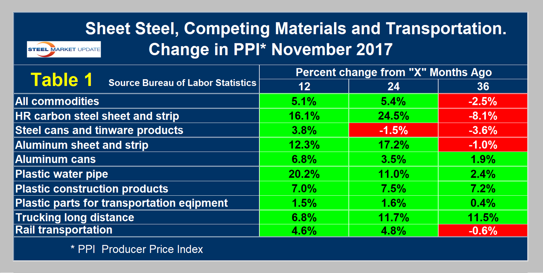Figure 1 shows the composite PPI of all commodities since January 2002. For this report, we have extracted comparative statistics for sheet steel, aluminum and plastic products and truck and rail transportation. Table 1 is a summary of each category on a year over one-, two- and three-year basis. The gain/loss pattern is shown by the color codes; we interpret rising prices as positive. Our reports in 2017 on a year/1-year basis have been much more positive than in any of our reports in the previous two years. Our analysis of the PPI data shows that commodity prices rose by 5.1 percent in 12 months through November, an improvement from the 2.5 percent decline in 36 months. The decline in the U.S. dollar this year has put upward pressure on those global commodities that are denominated in U.S. dollars.