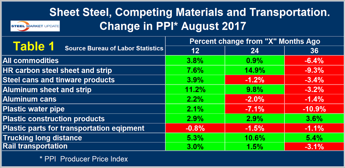 For this report, we have extracted comparative statistics for sheet steel, aluminum and plastic products, and truck and rail transportation. Table 1 is a summary of each category on a year over one-, two- and three-year basis. The gain/loss pattern is shown by the color codes; we interpret rising prices as positive.
