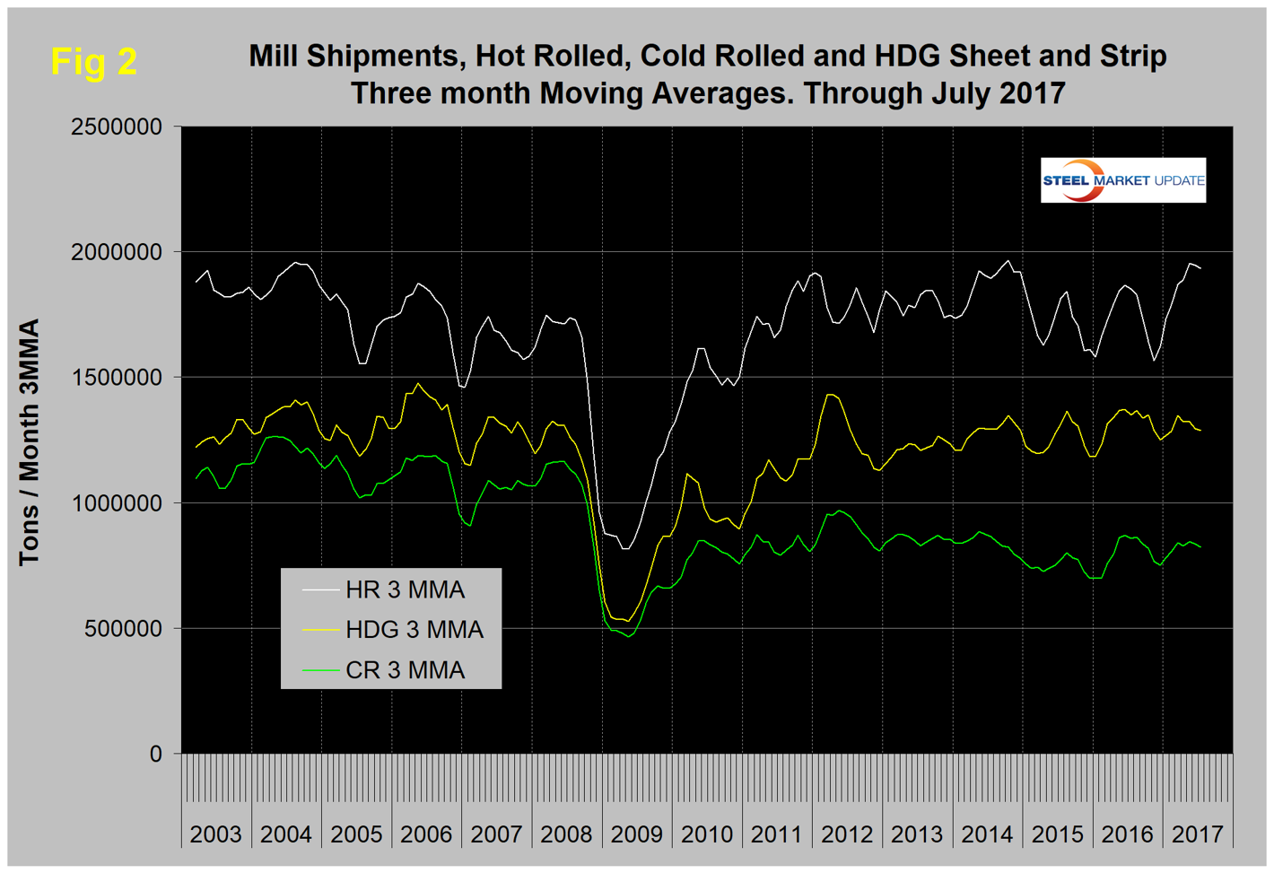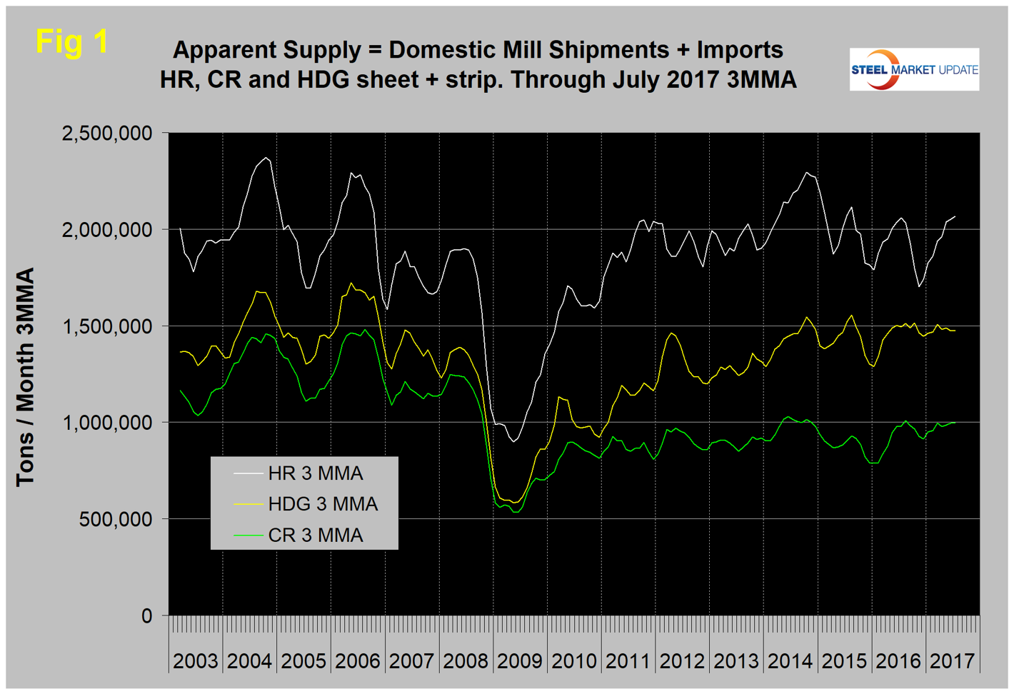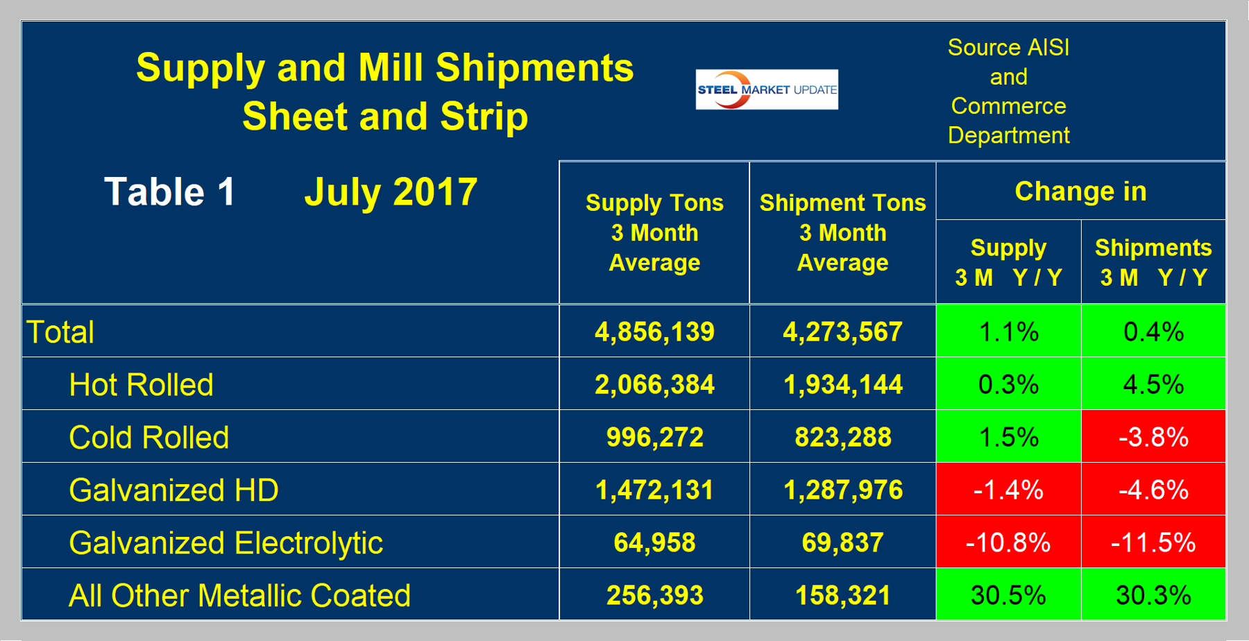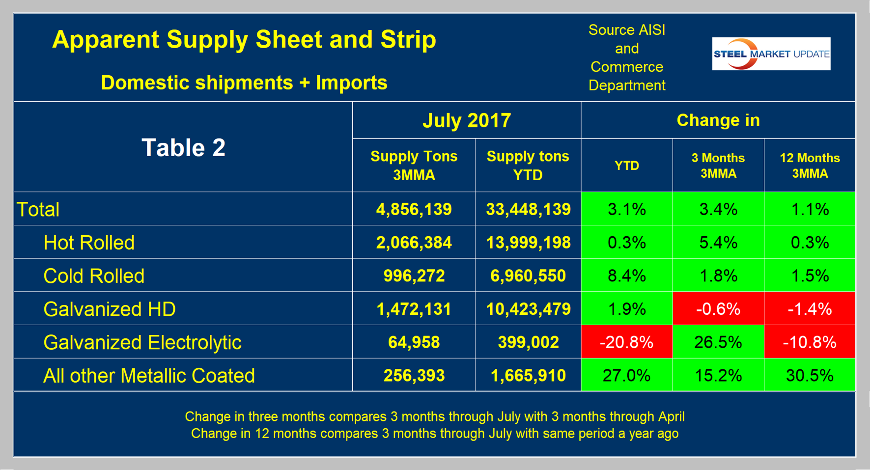 Table 1 describes both apparent supply and mill shipments of sheet products (shipments include exports) side by side as three-month averages through July for both 2016 and 2017. Apparent supply is a proxy for market demand.