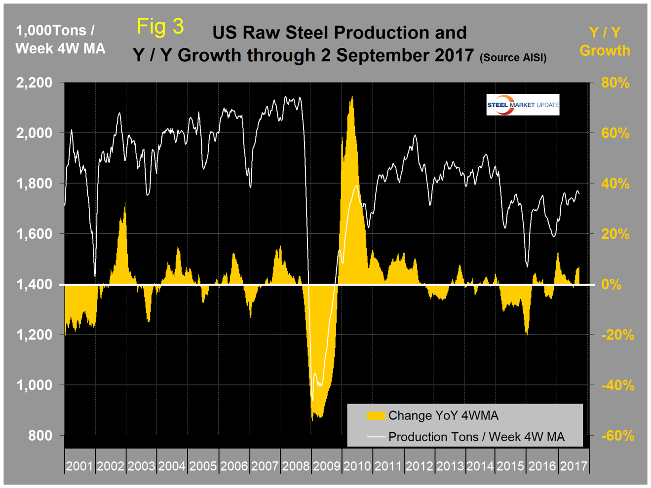 SMU Comment: A problem with this data is that it’s now well into September and the latest information that we have for shipments and supply is for July. AISI puts out weekly data for crude steel production, the latest of which was for the week ending Sept. 2. This provides the most current data for steel mill activity. Figure 3 shows the year/year change in weekly crude output on a four-week moving average basis.
