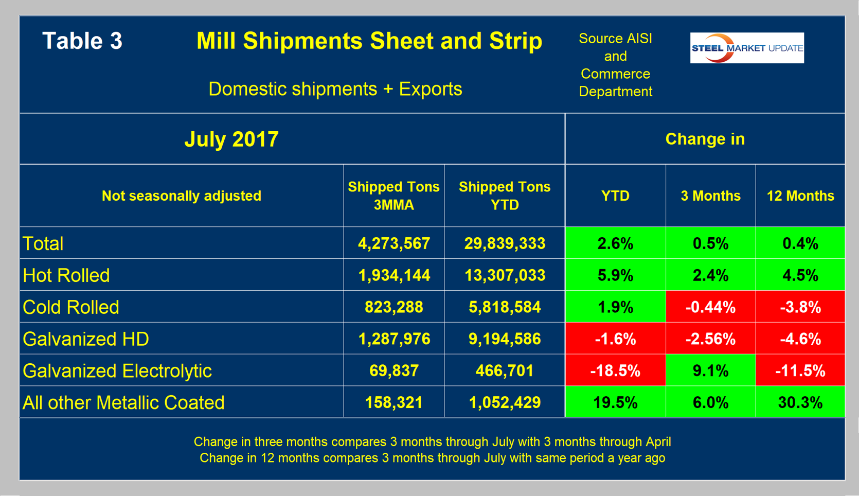 Apparent Supply: Apparent supply is defined as domestic mill shipments to domestic locations plus imports. In the three months through July 2017, the average monthly supply of sheet and strip was 4.856 million tons, up by 1.1 percent compared to the same period ending in July 2016 (year/year). In the three months through July compared to the three months through April, supply was up by 3.4 percent. The short-term increase (three months) compared to the long-term improvement (12 months) means that through July momentum was positive. There is no seasonal manipulation of any of these numbers. By definition, year/year comparisons have seasonality removed, but 3m/3m comparisons do not. Table 2 shows the change in supply by product on this basis through July. Momentum was positive for all sheet products except OMC, but OMC still had the highest growth rate.